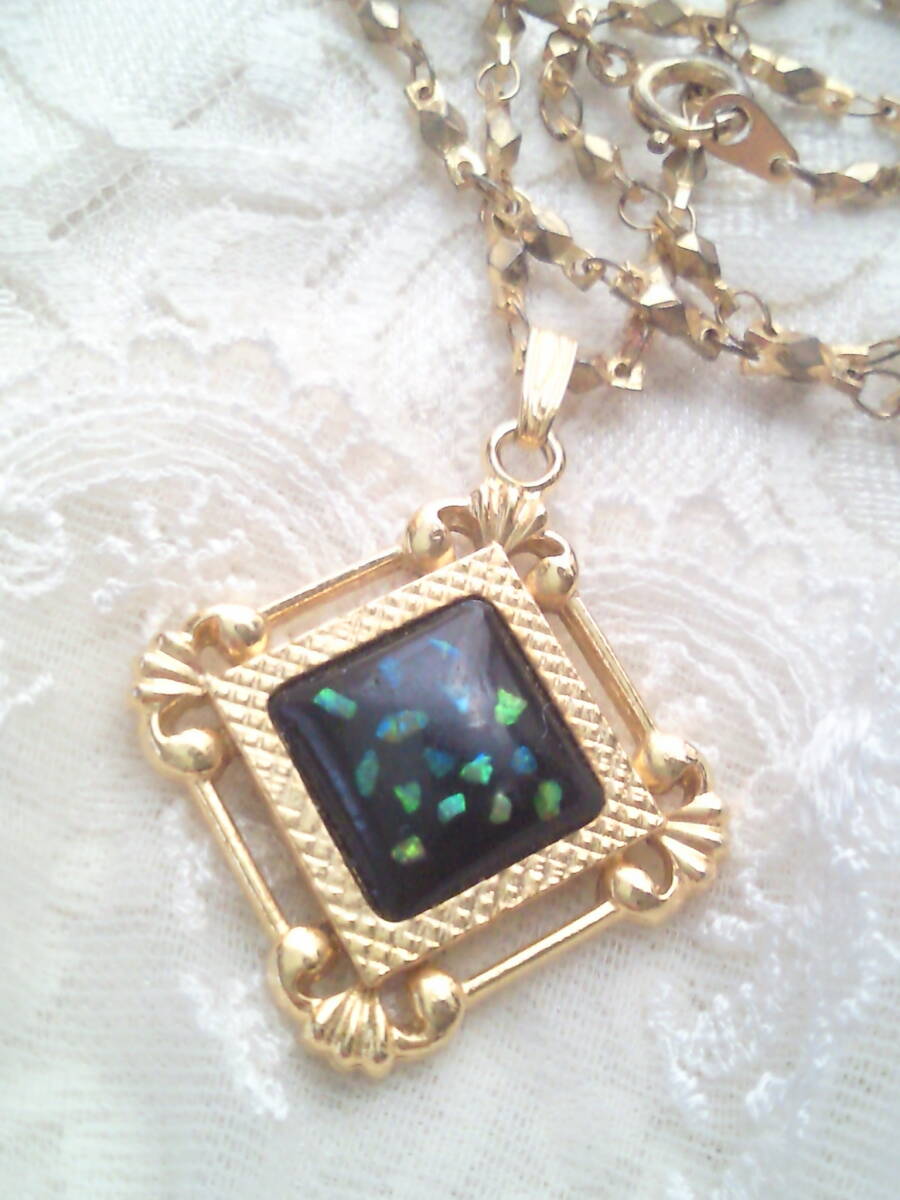 オパール天然貝ネックレス◆モザイクオパール風ペンダント◆昭和レトロ◆金枠ヴィンテージ品アンティークジュエリー◆男女兼用品◆送料無料