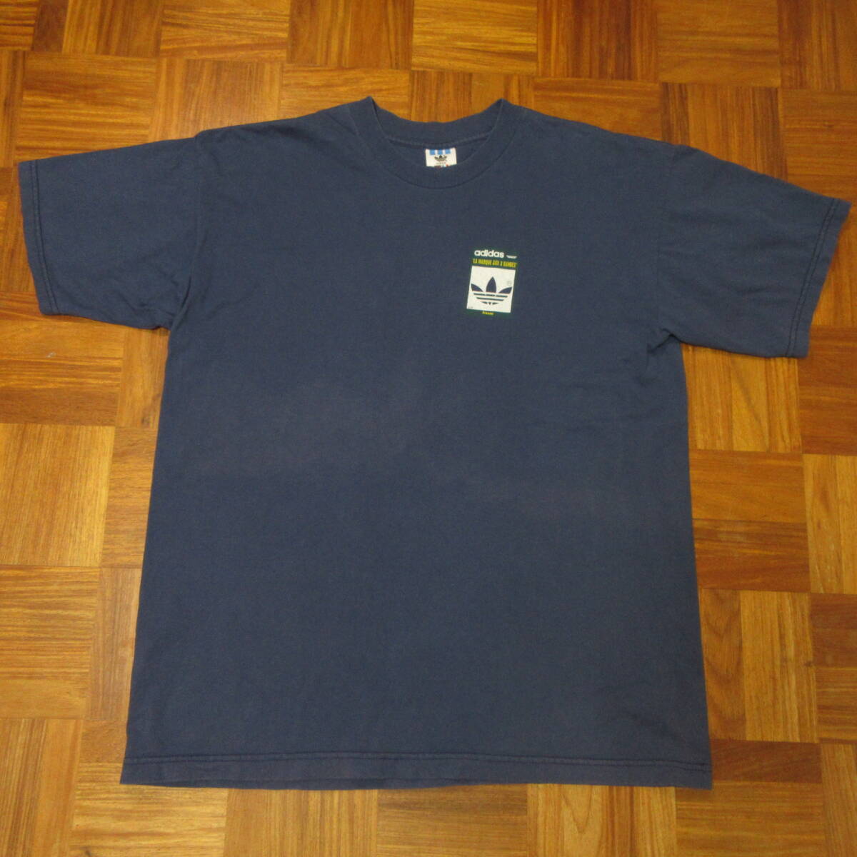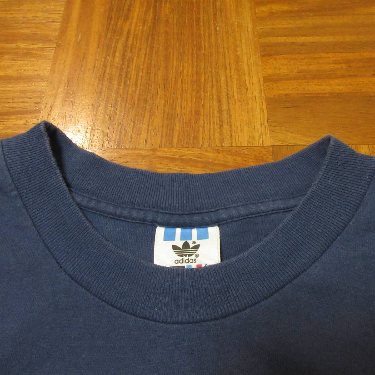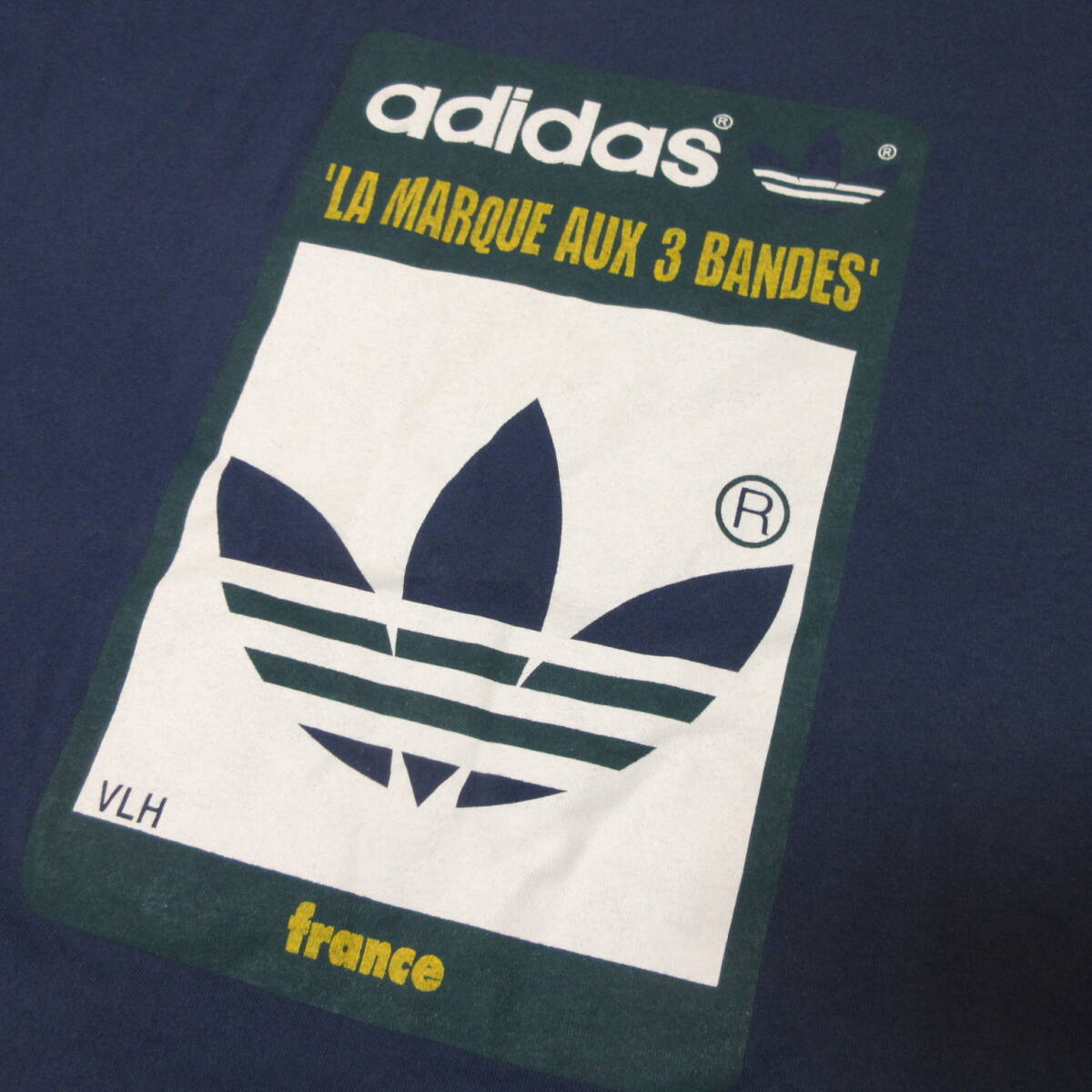 80~90s USA製 adidas LA MARQUE 3 BANDES アディダス バックプリントTシャツ ネイビー US規格サイズL(大きめ) 送料230円