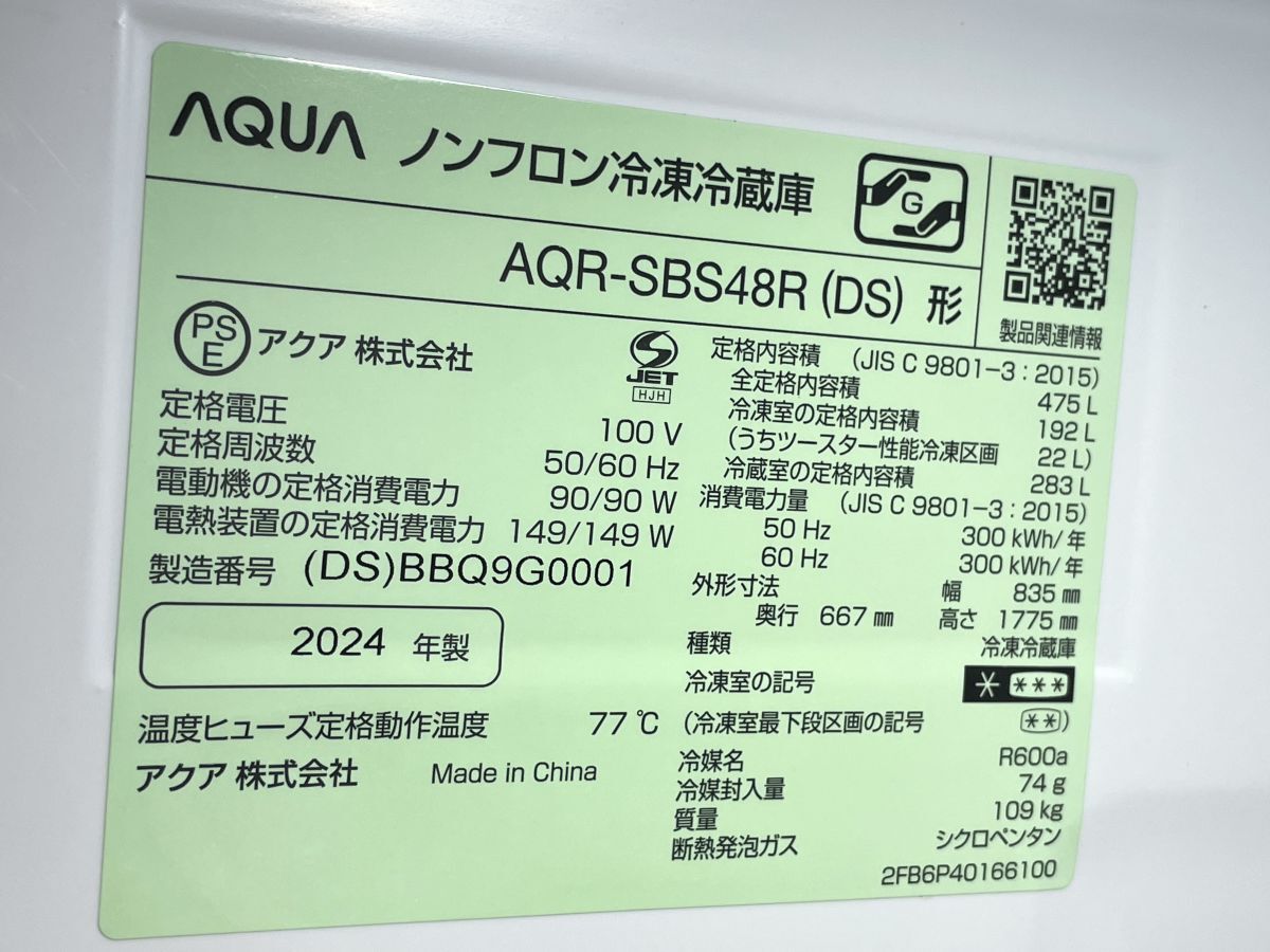 【M655】美品 2024年製 アクア/AQUA ノンフロン冷凍冷蔵庫 AQR-SBS48R-DS 2ドア 475L フレンチドア 観音開き ダークシルバー b | ||