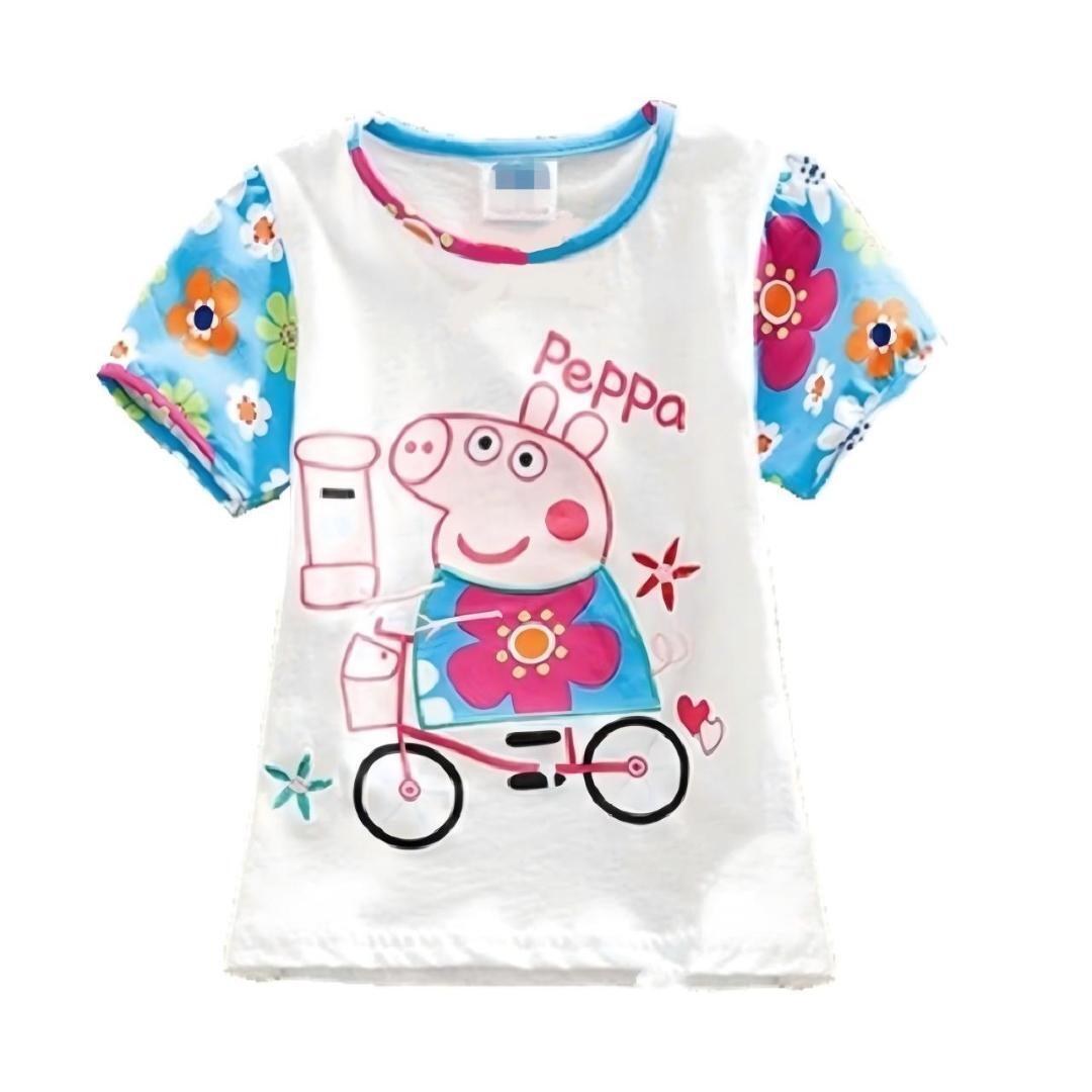 - 白いトップスにはペッパピッグが自転車に乗っている愛らしいデザインが施されており、袖部分には鮮やかなフラワー柄があしらわれています。