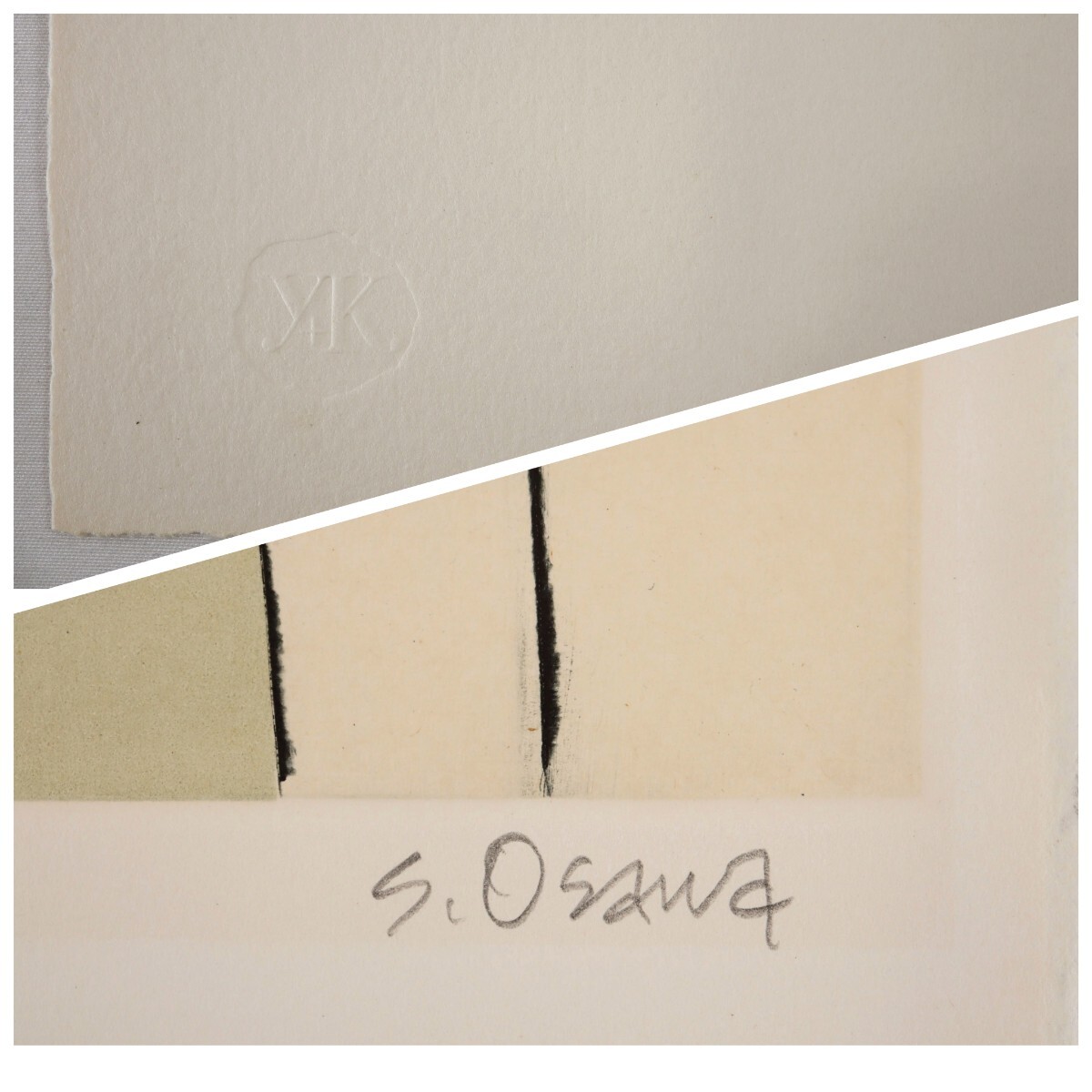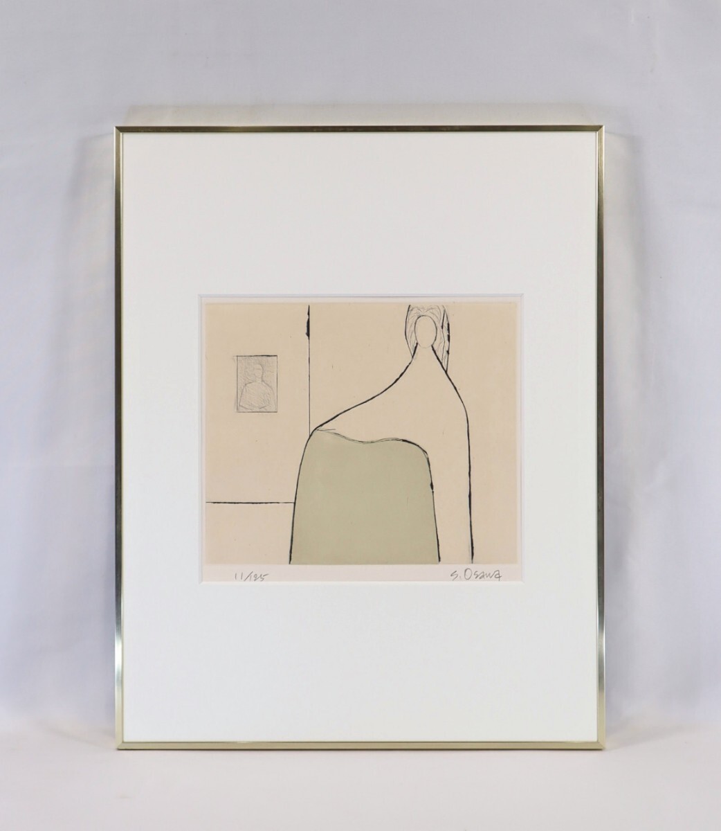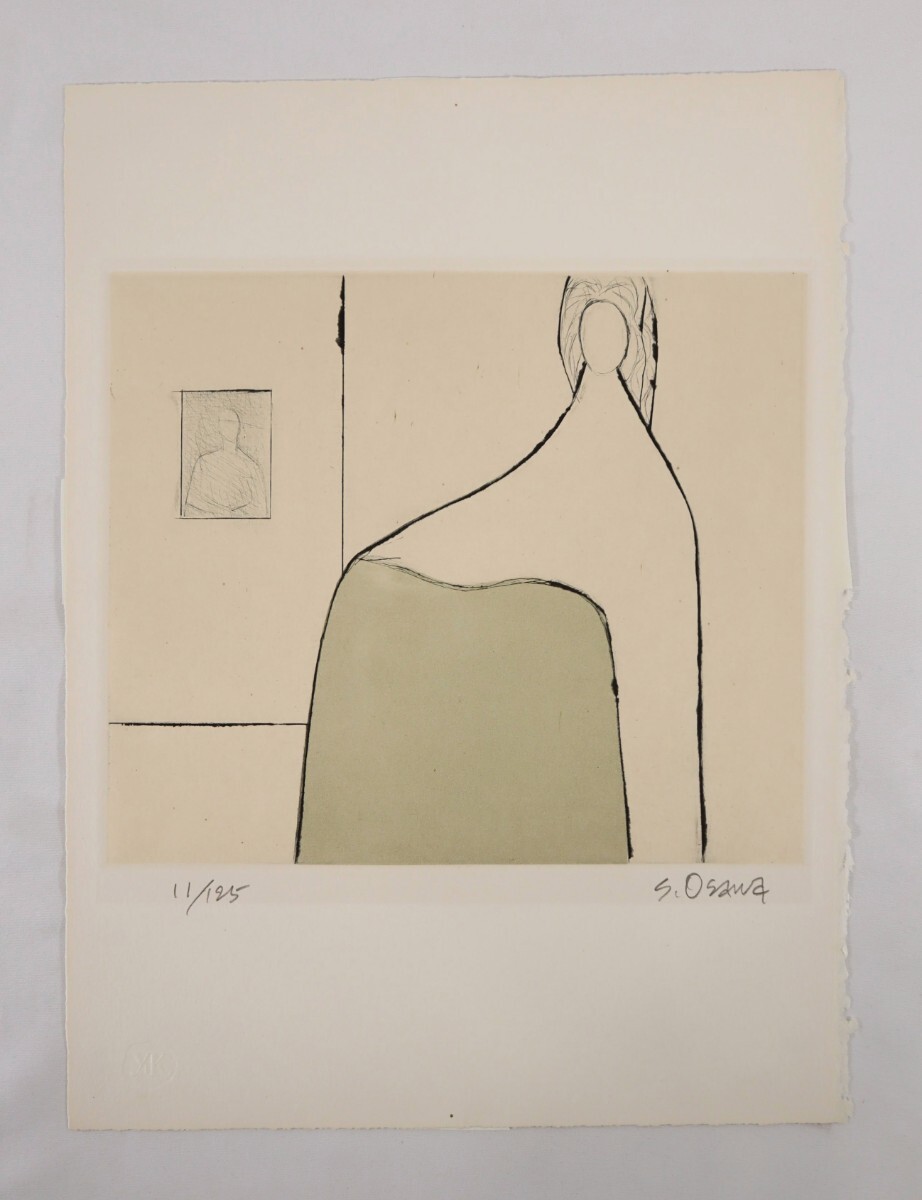 真作 大沢昌助 1978年 銅版画「花の日」画寸25×21.5cm 東京都出身 多摩美術大学教授 簡潔な線に明快な色面と大胆な構図の斬新な作品 11191