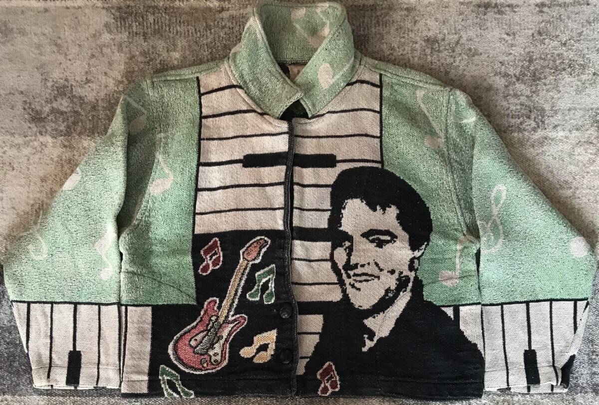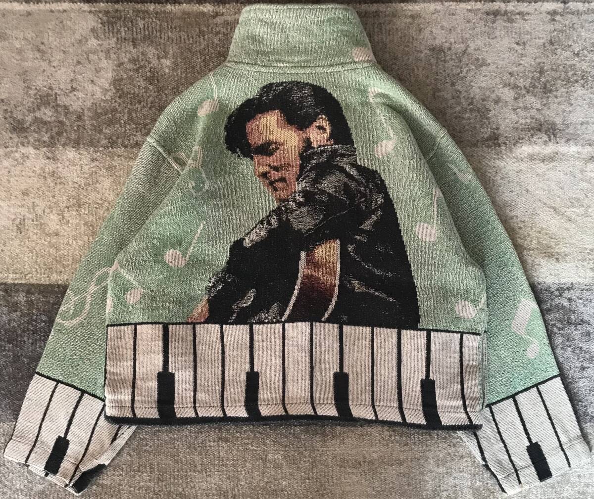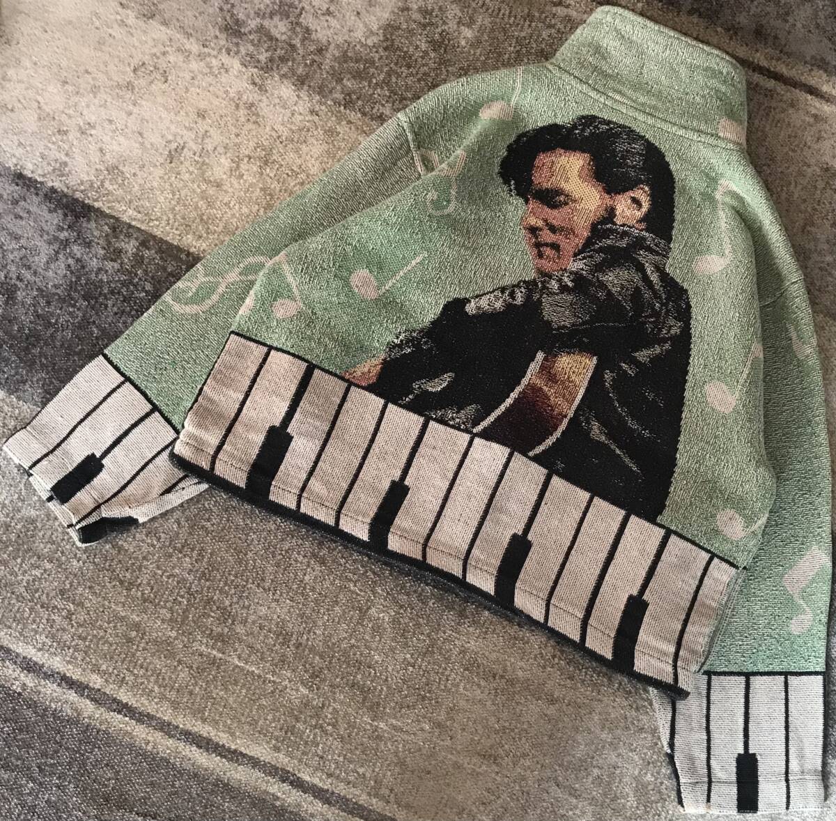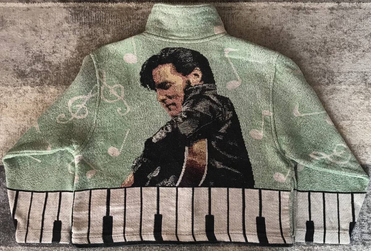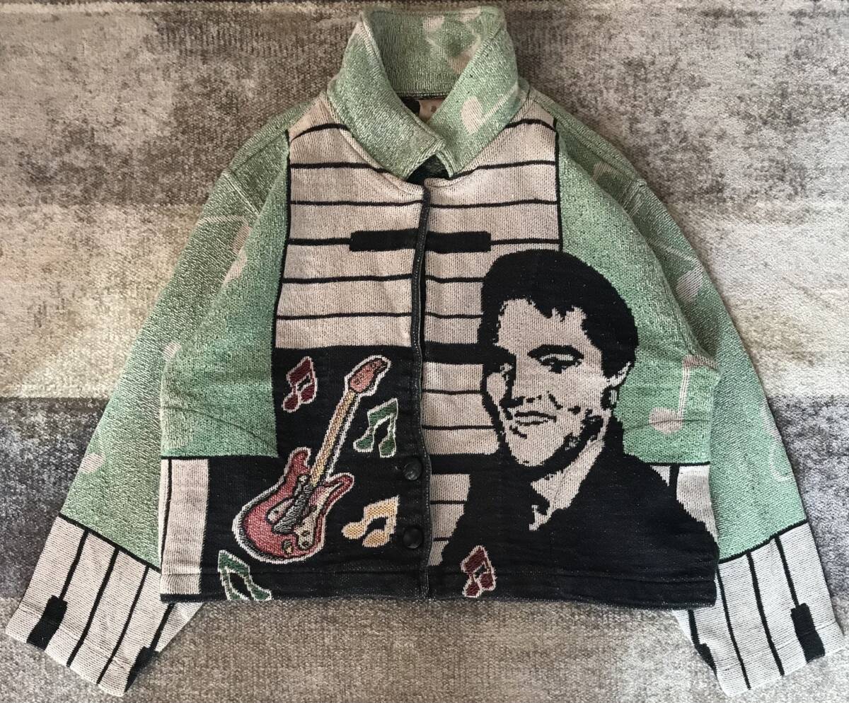 往年のロックスター 超スペシャル US製 80's vintage ★ SCENEWEAVER ★ エルヴィスプレスリー エルビスプレスリー キングオブロックンロール 追悼品 ロカビリー ギター ピアノ 鍵盤 音符 ゴブランジャケット ナポレオンジャケット L/XL です。