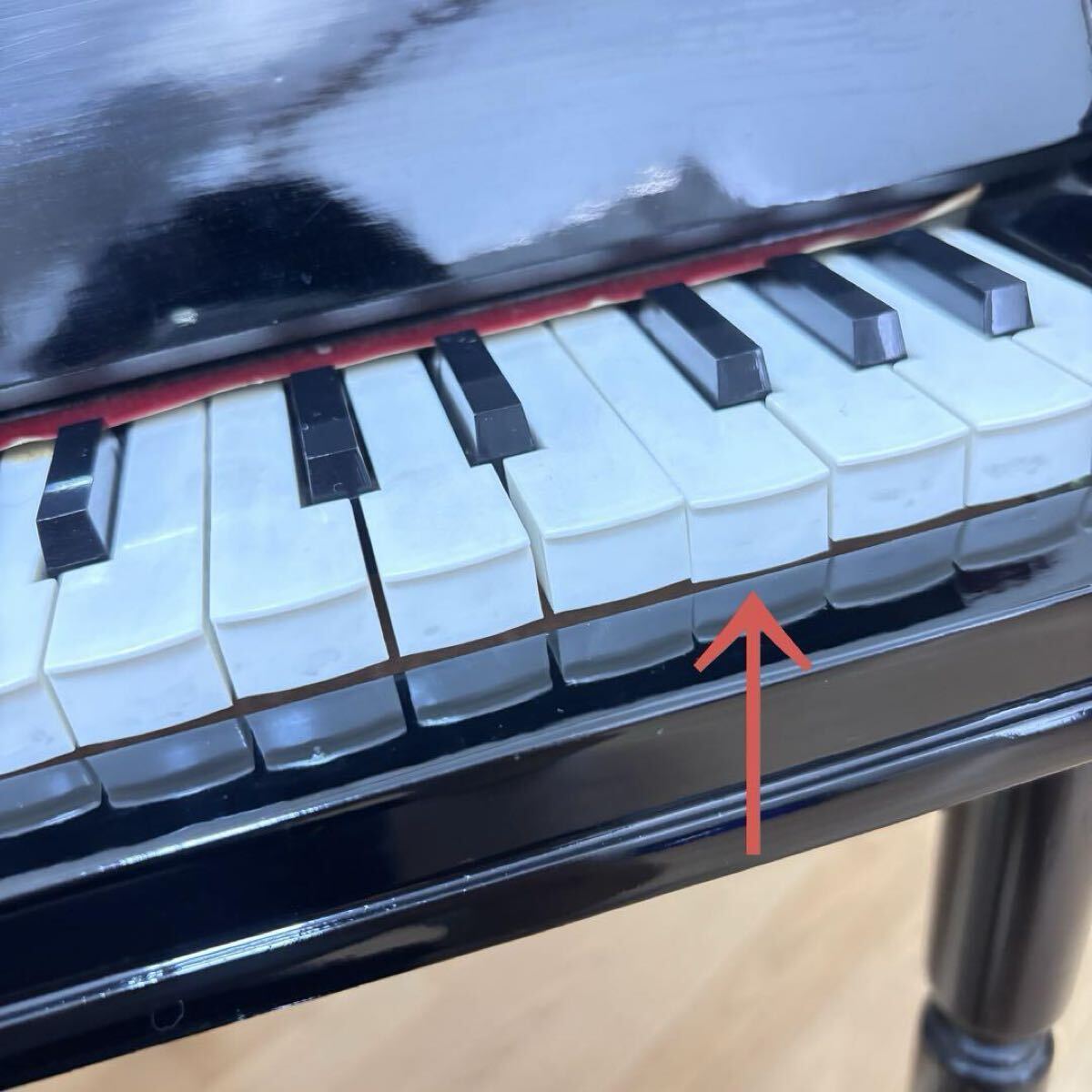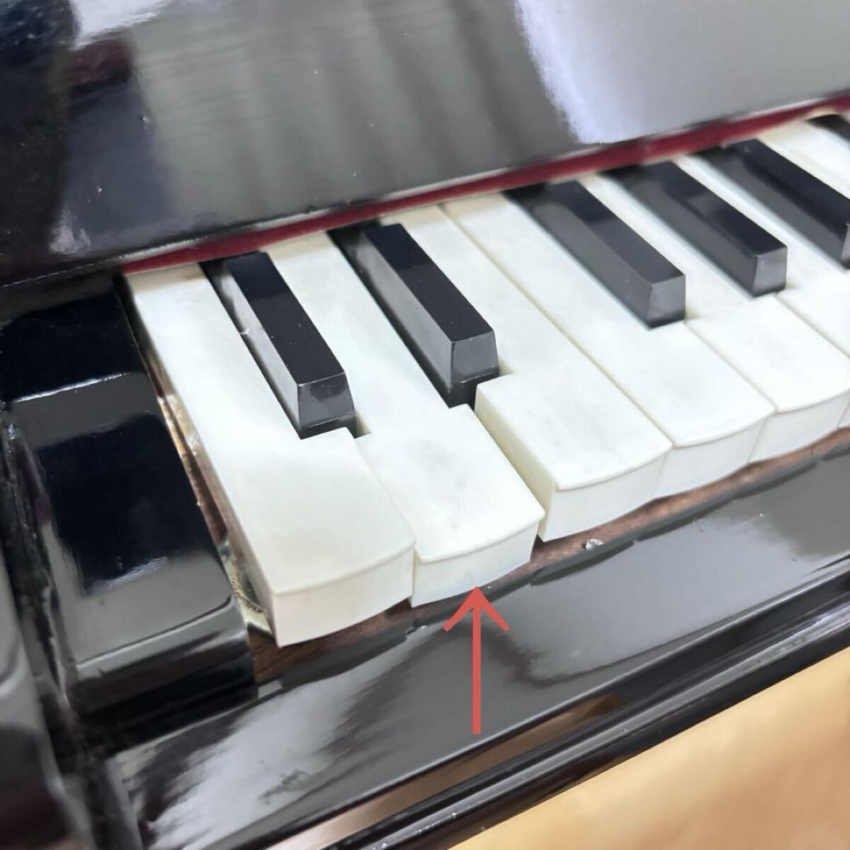 ※鍵盤落ちしている箇所が2箇所(赤の矢印)ございます。鍵盤落ちしていても音自体は鳴らせます。指で軽く引っ張ると戻ります。