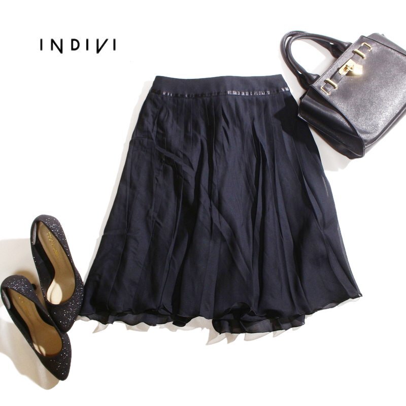 美品 インディヴィ INDIVI 株) ワールド 春 夏 ほんのり艶 オーガンジー プリーツ フレアスカート 9号 38 ブラック 黒 オフィス 通勤 綺麗