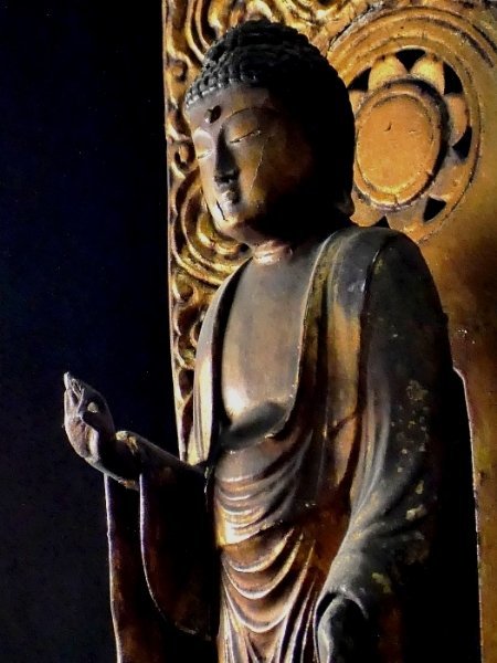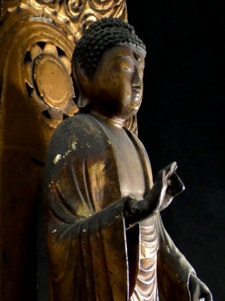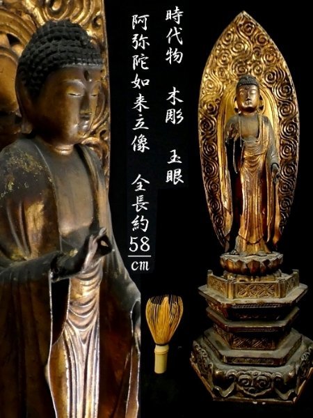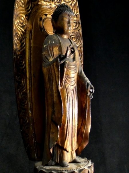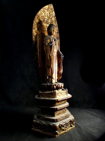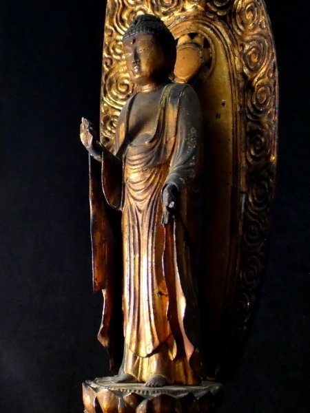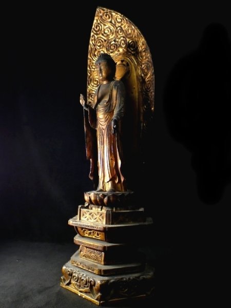 | 商品説明 | ~寸法~ 光背と台座を含む御本尊の全高・・・ 約 58.5cm 玉眼の施された時代物の仏様です。 時代は江戸期と推測しております。 画像にてご確認下さい。 大切にして頂ける方の元へ届けば幸いでございます。 ~状態~ 状態は画像の通りとなります。 経年による光背部分の割れや両手指の欠け 両手首の補修跡など多少のキズや傷みはございますので 画像にてご確認下さい。 許容範囲内の時代傷みはご理解下さい。 |