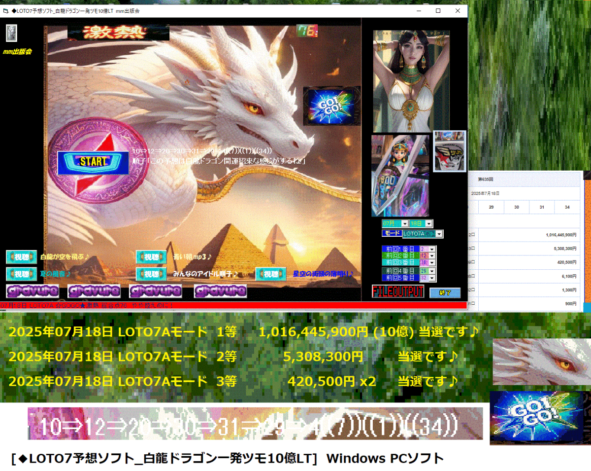 夏新作[◆LOTO7予想ソフト_白龍ドラゴン一発ツモ10億LT] 2025年07月18日 LOTO7 1等  1,016,445,900円 (10億) 当選です♪
