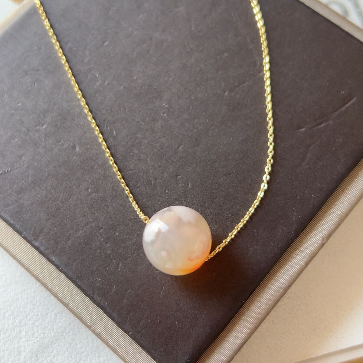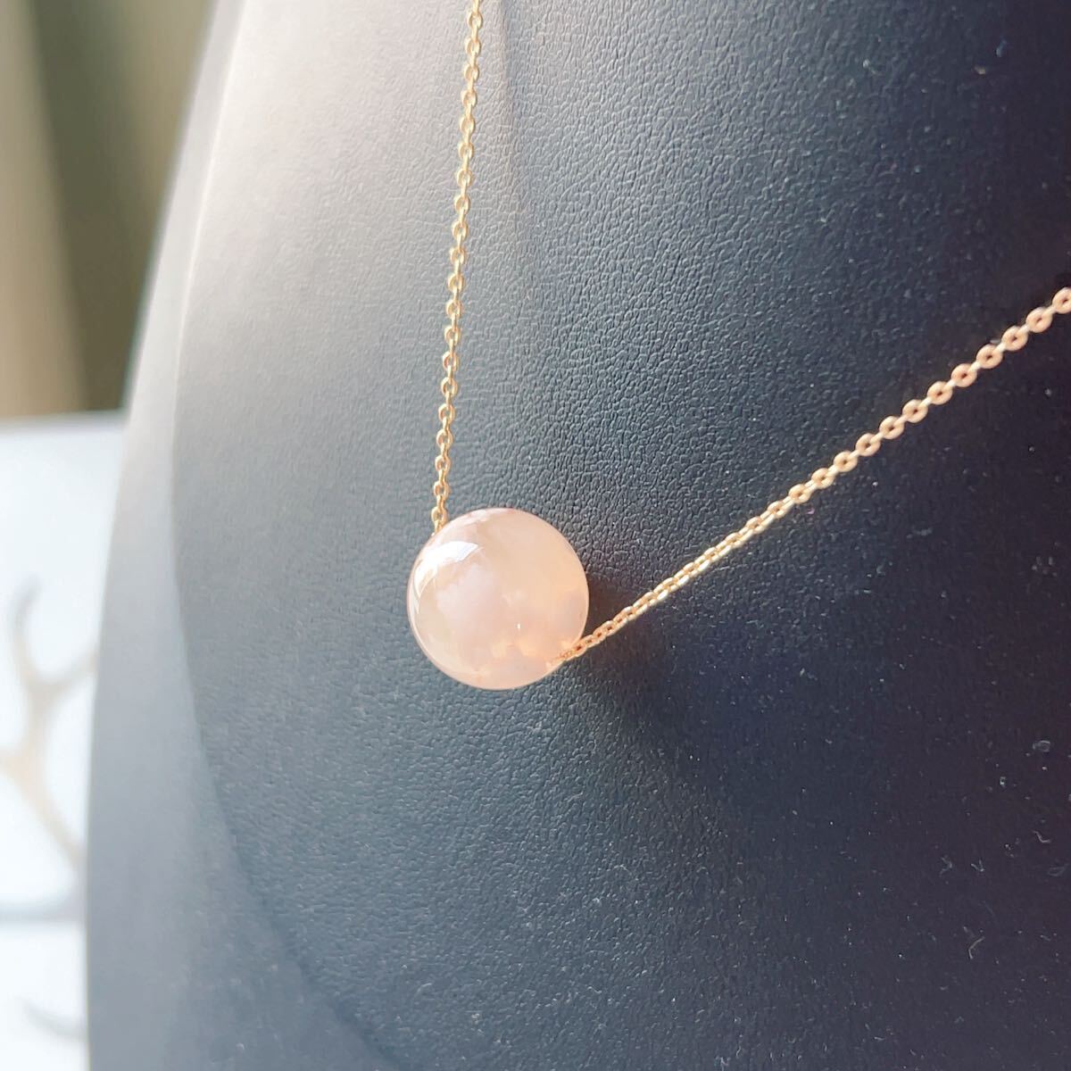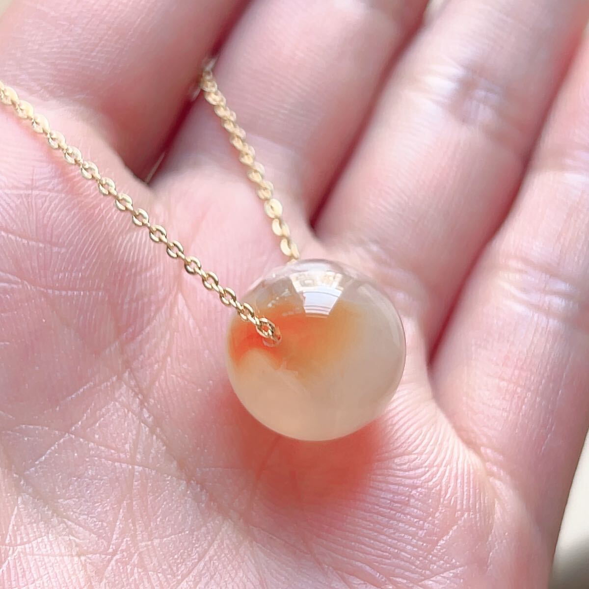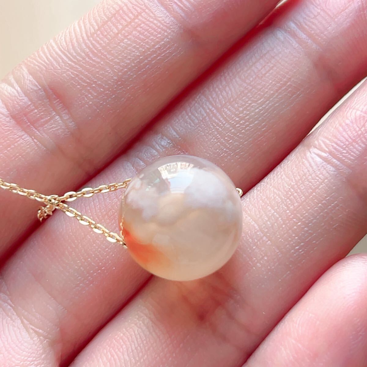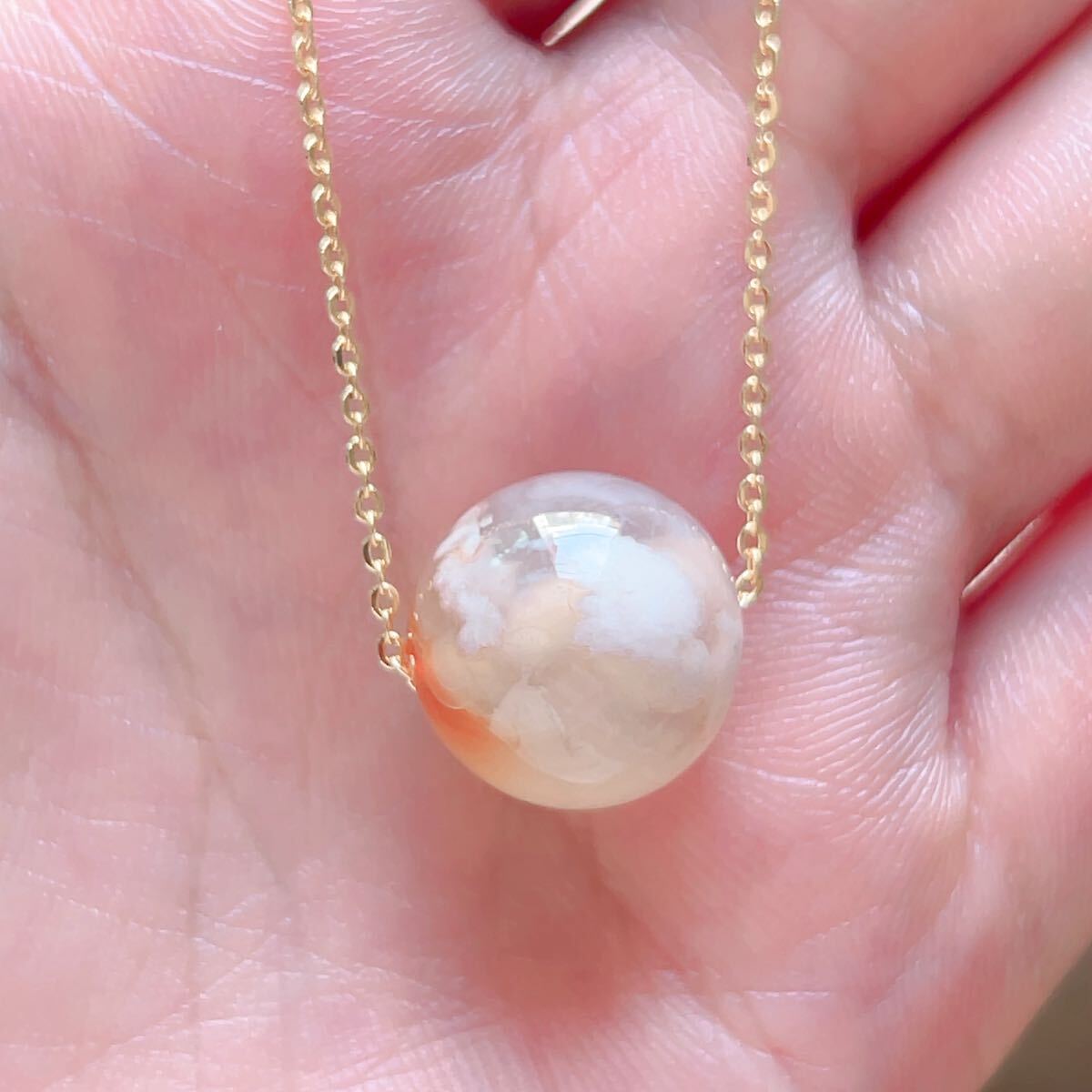 淡い透明感のあるピンクのアゲードの中にまるで桜の花が咲いてるかのように見えるパワーストーンです