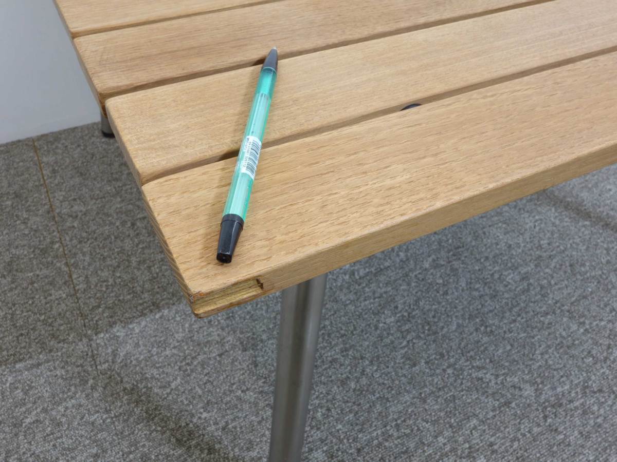 ◆天然木特有のソリやゆがみがあります。天板角に2ヶ所欠け、天板裏面にシミのような跡があります。脚はスレ跡があります。