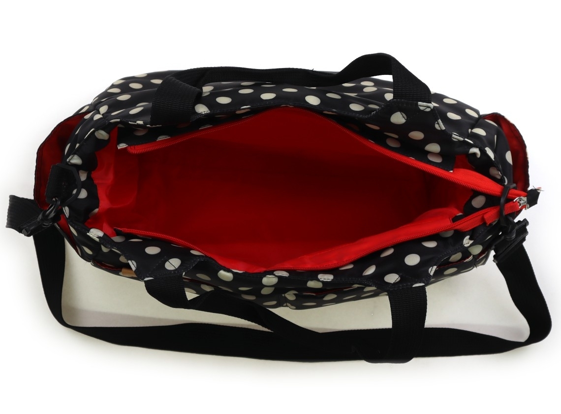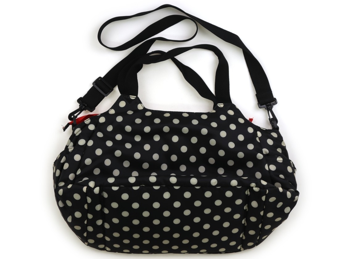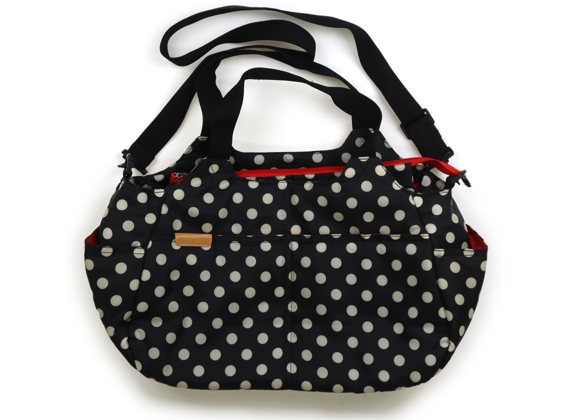 マザーズバッグ。約28.5×49×19.5cm。ショルダーは調節可能で、中くらいの長さで約82.5cmです。ポリエステルのようなシャカシャカした生地感です。小さな薄い汚れがいくつか見受けられますが、使用頻度は少なそうです。