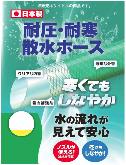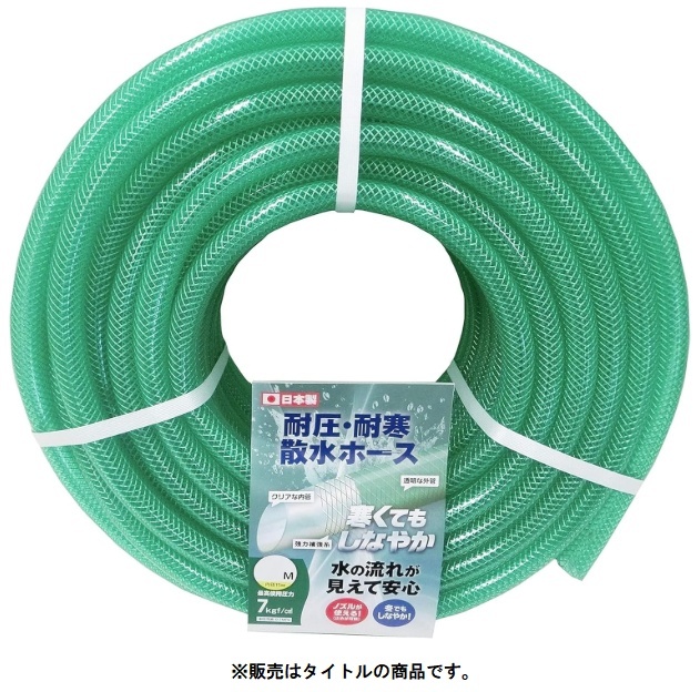 浅香工業カクイチ耐圧・耐寒散水ホース品番:281400■特長・寒くてもしなやか。水の流れが見えて安心。・特長2:クリアな内管・透明な外管・強力補強糸。・止水ノズル使用可能。■仕様・ホース径:内径15mmx外径20mm・長さ:5m