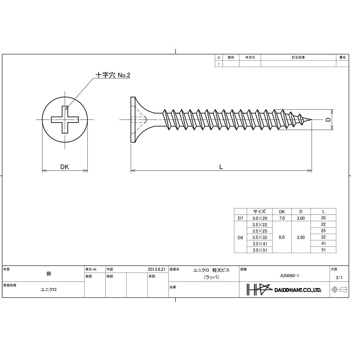 ダイドーハント (DAIDOHANT) 軽天ビス ユニクロ (呼び径d) 3.0 x (長さL) 20mm (ラッパ頭) [ 鉄/ユニクロメッキ