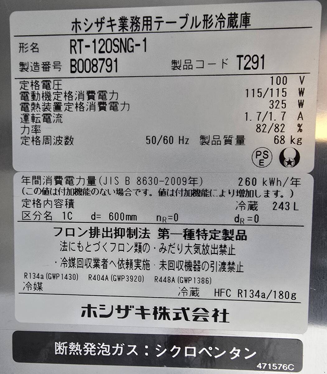 ホシザキ 台下冷蔵庫 RT-120SNG-1 2022年製 100V 1200×600×800 コールドテーブル 業務用 飲食店 厨房機器 C2507-308 | ||