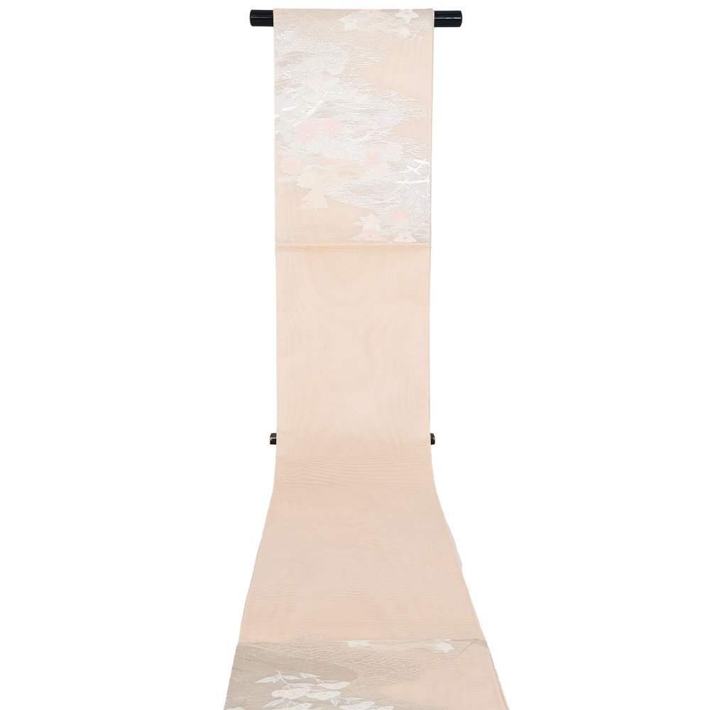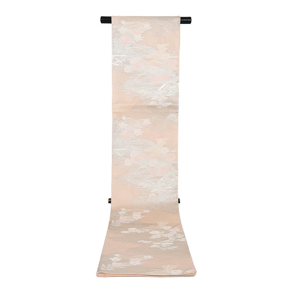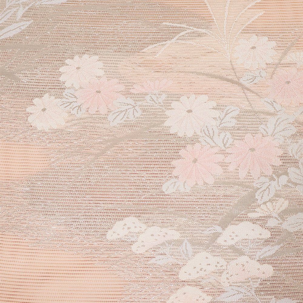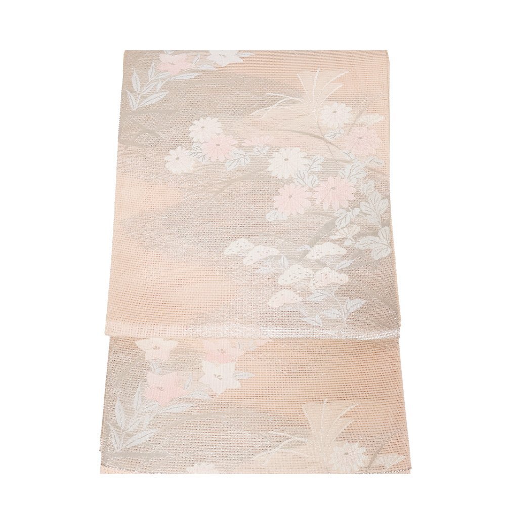 | 絽 西陣織袋帯 ピンク・銀箔地 菊・桔梗・オミナエシ 未使用品 仕立て上がり | |