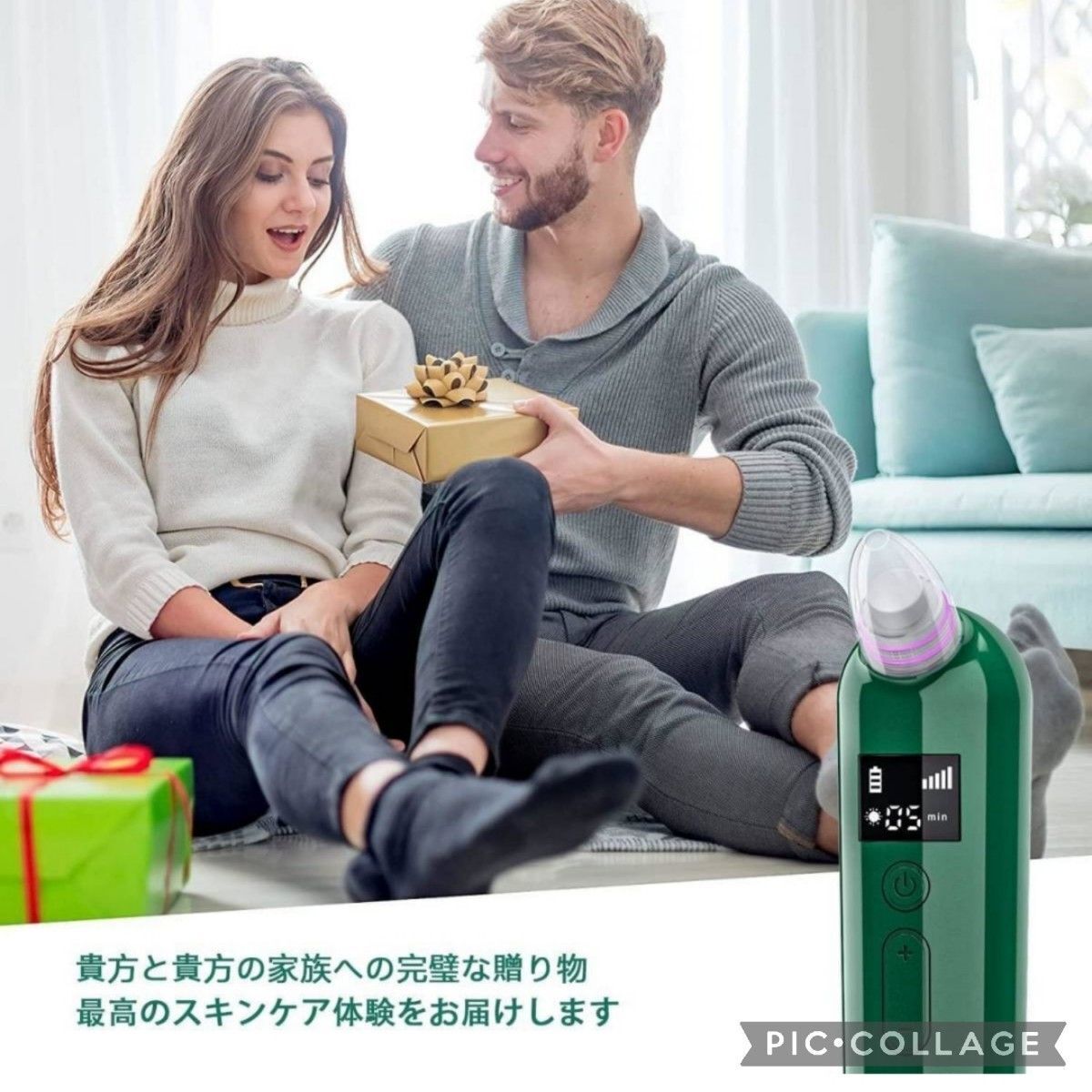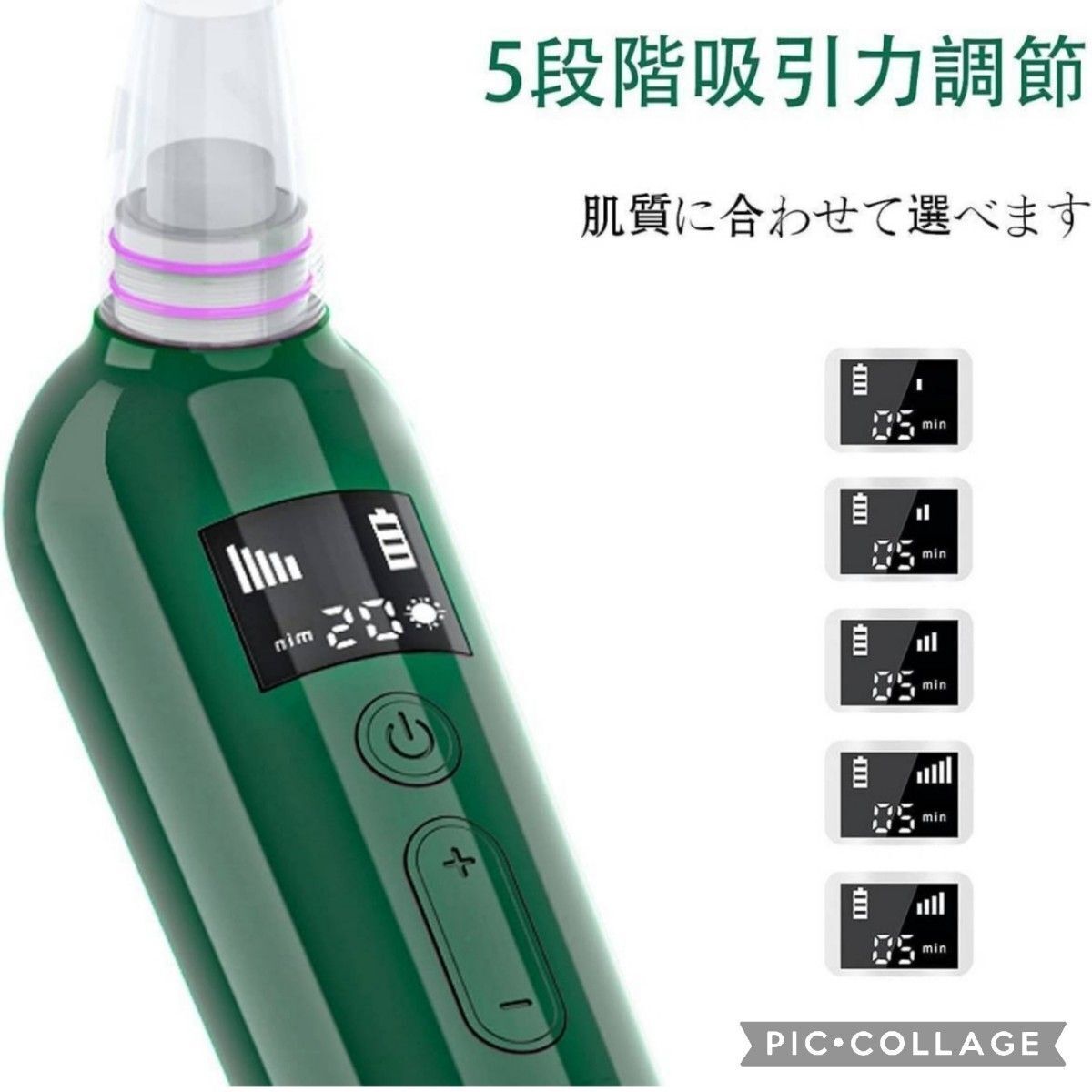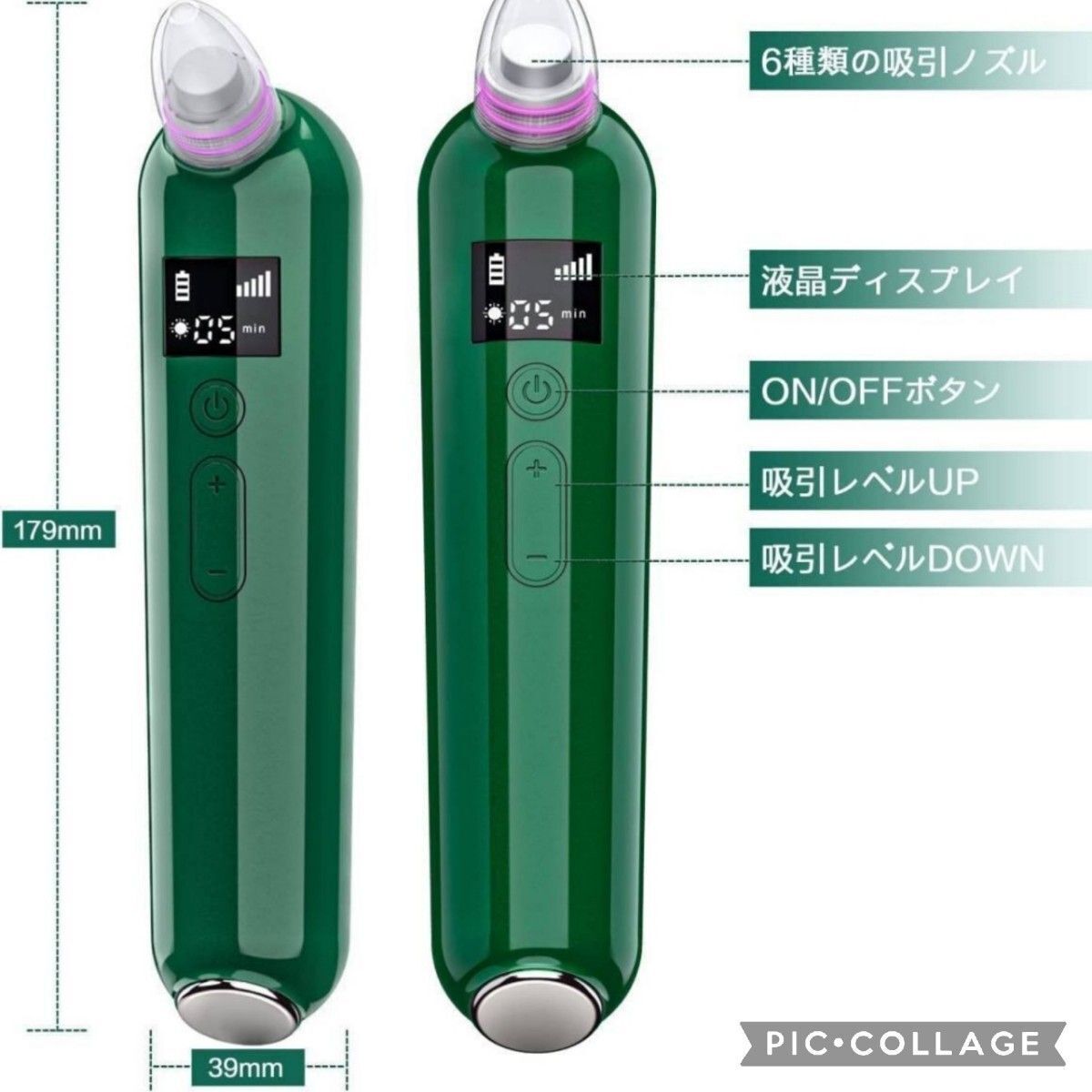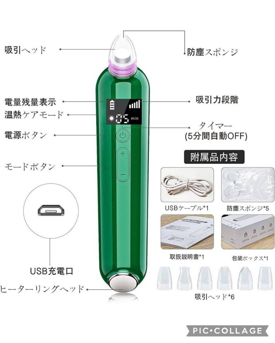 毛穴吸引器 美顔器 6種類の吸引ヘッド 5階段吸引力 セルフエステ 日本語説明書付き フェイスケア 高品質 グリーン 緑