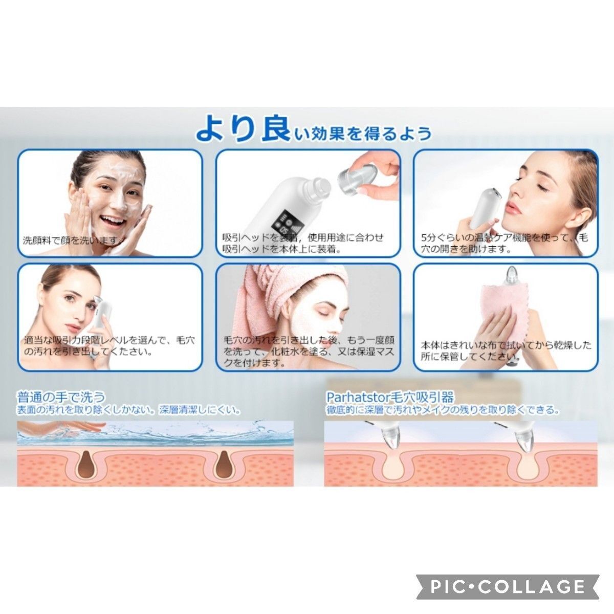 6種類の交換ヘッド付き、ヘッドの切り替えが簡単で、どなたもお気軽にお使いいただけます。異なるヘッドでは吸引口の大きさを変えることにより、お肌に合った吸引力と用途を選ぶことができます。