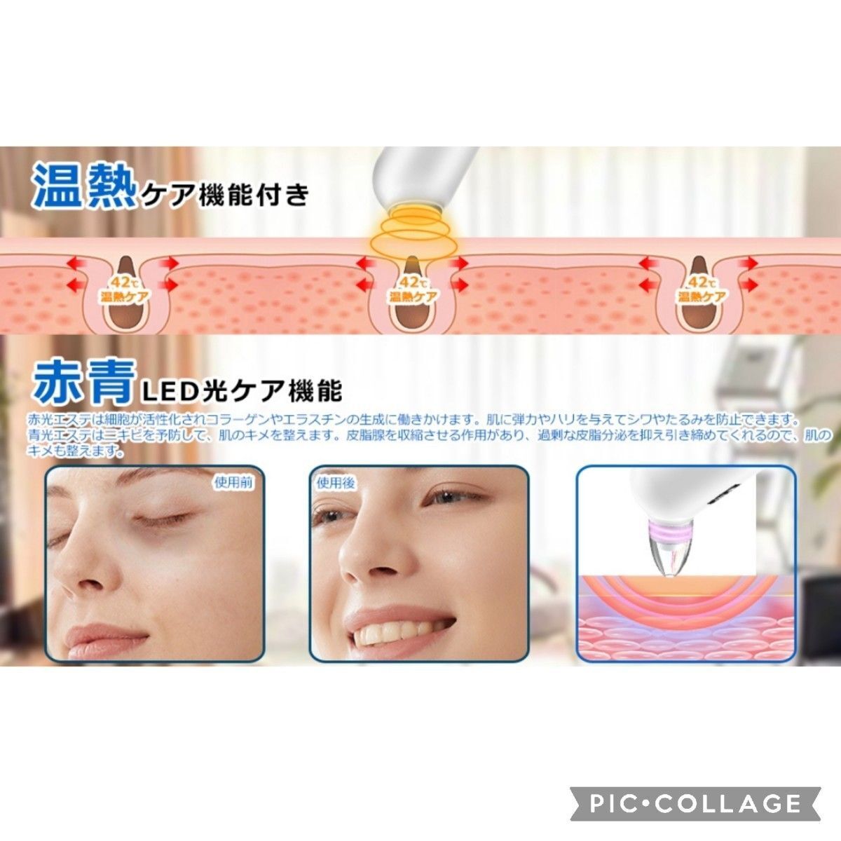 ホットタオルと同様に、毛穴を開かせる効果があります。毛穴のケアを行う前に、まずは本器のヒーターヘッドで温熱ケアを行って、毛穴を開かせた後、より効果的に毛穴に詰まった汚れを吸い取ります。使用後にはティッシュや布などで拭いてください。