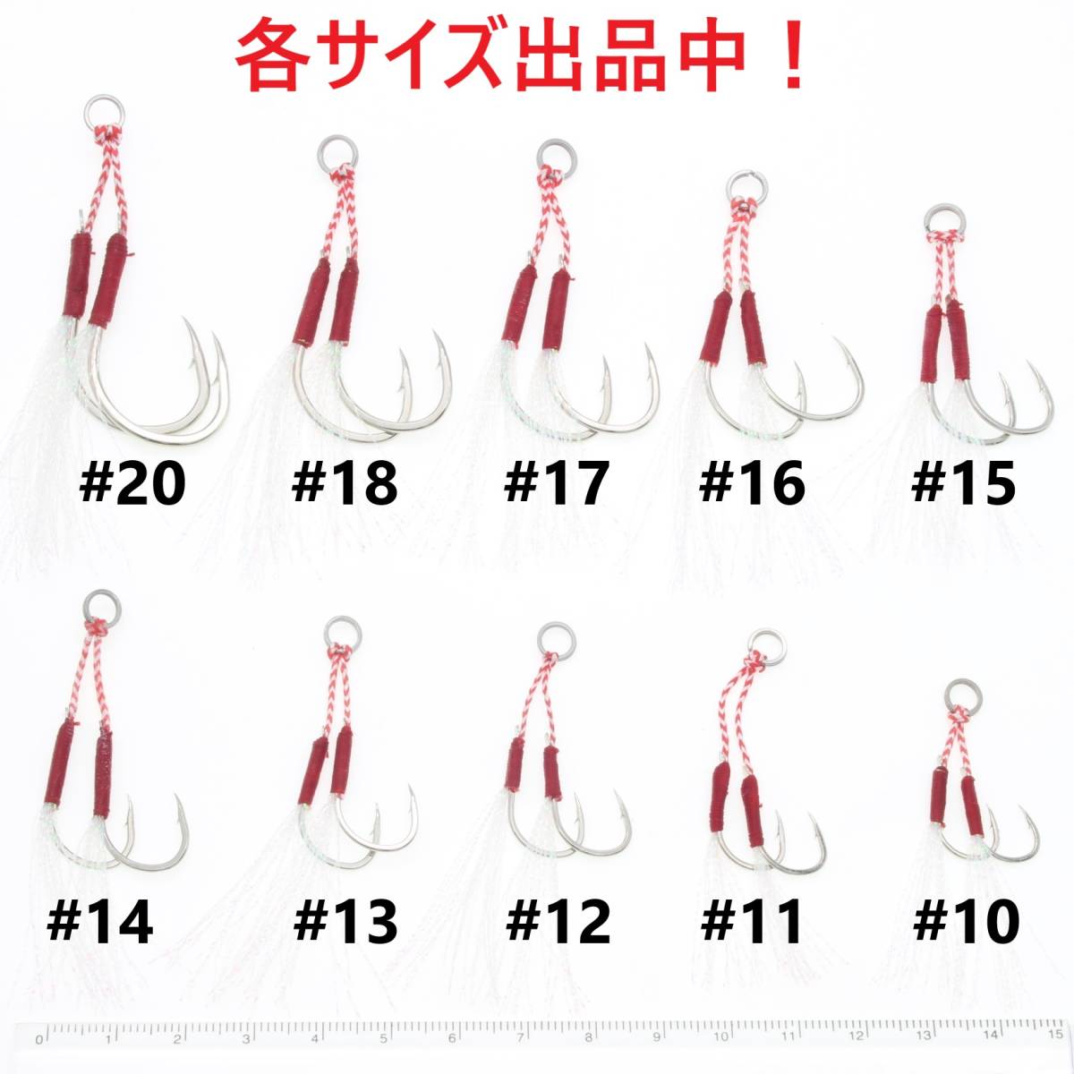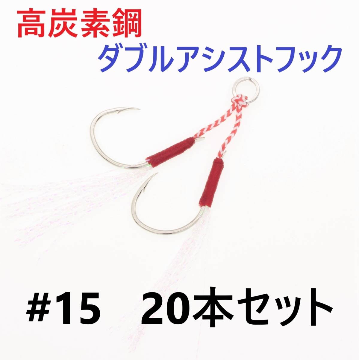 【送料無料】高炭素鋼 ダブル アシストフック #15 20本セット 針40本 ジギング メタルジグ 伊勢尼針 ティンセル スプリットリング付き