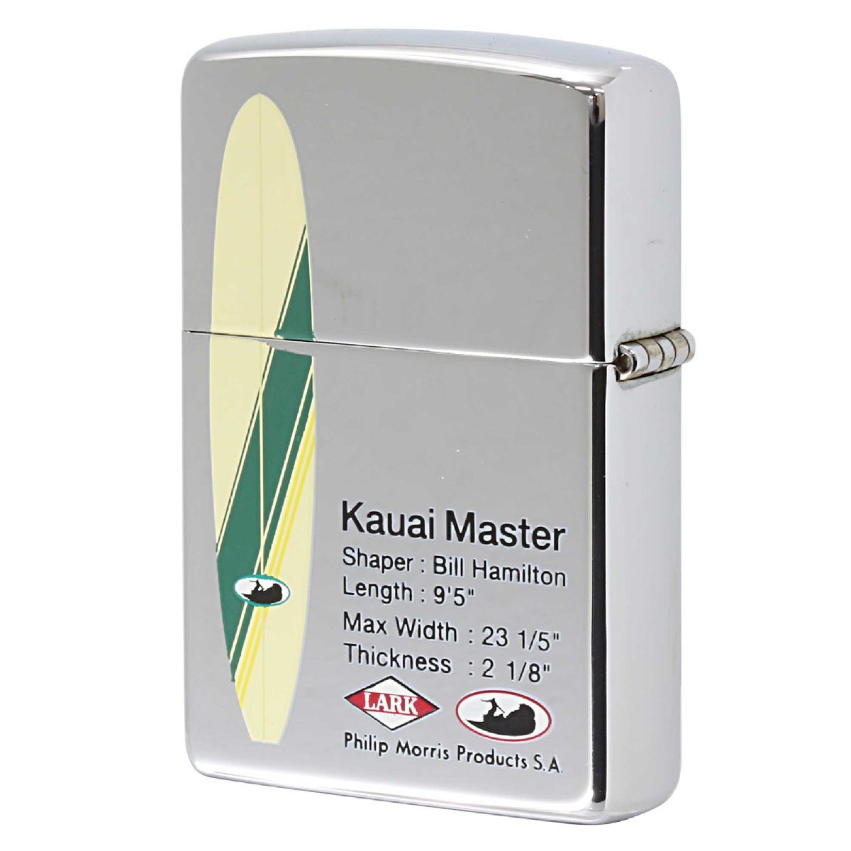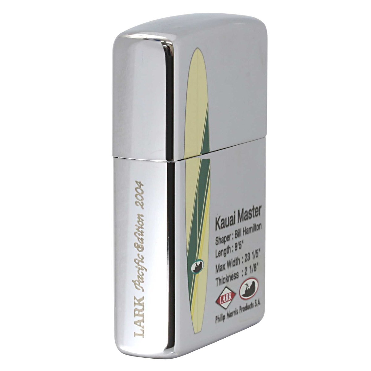 「LARK Pacific Edition 2004」は、伝説のシェイバー、ドナルド・タカヤマ氏が手がけ、ラークがデザインしたサーフボードをモチーフに製造されたZIPPO。ハイポリッシュクローム、プリント。