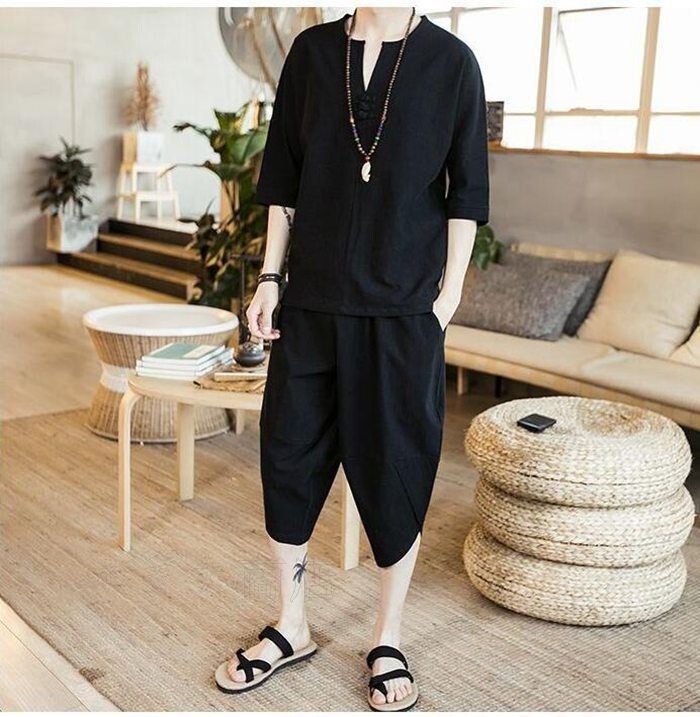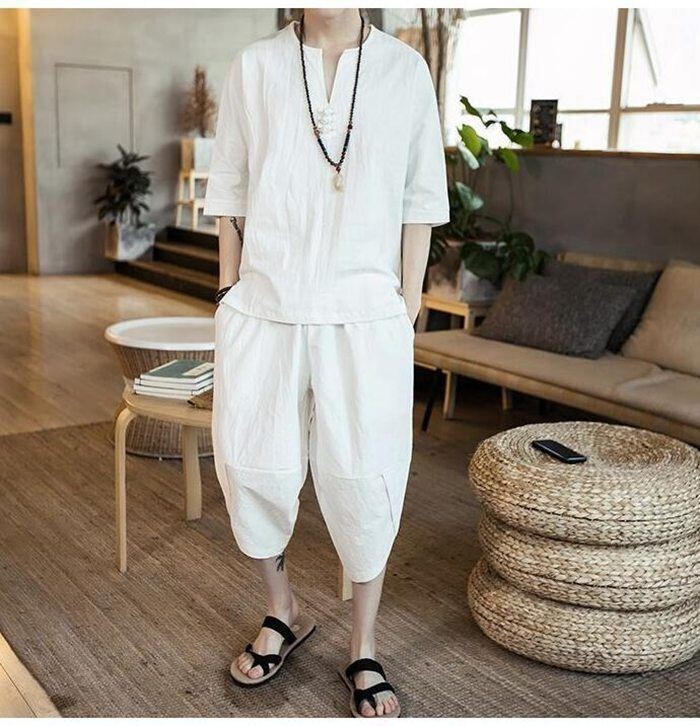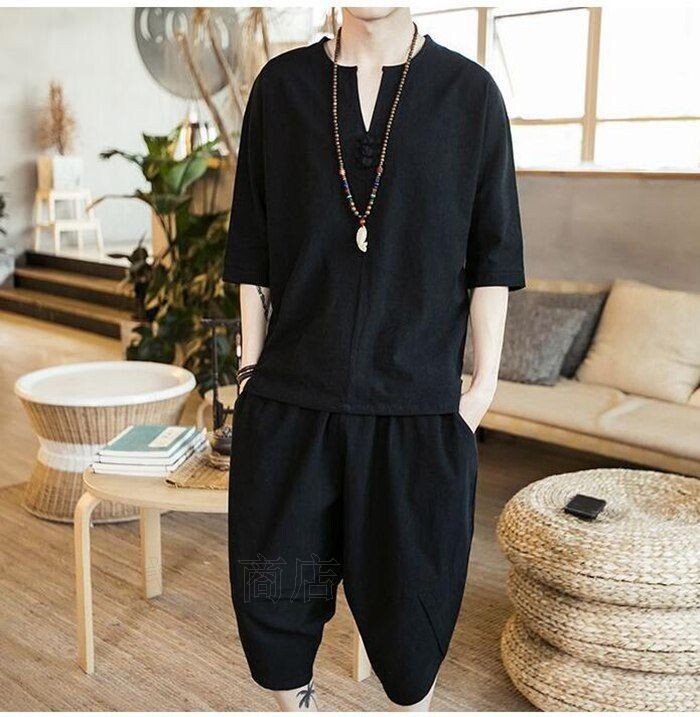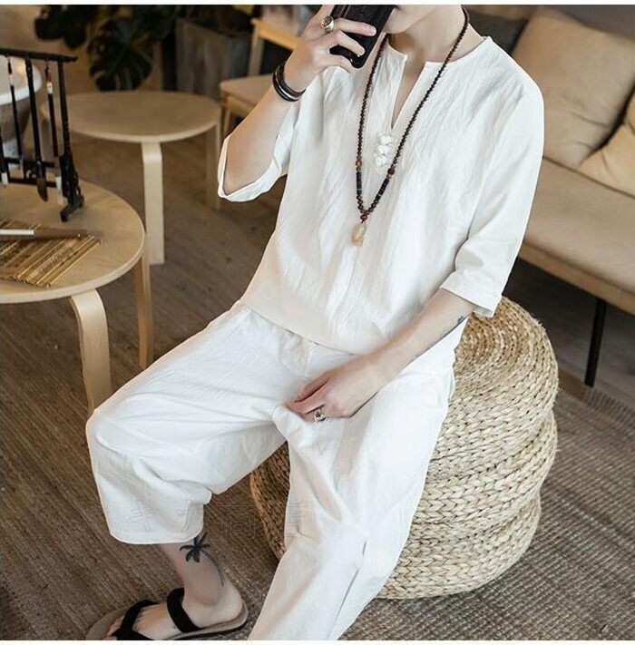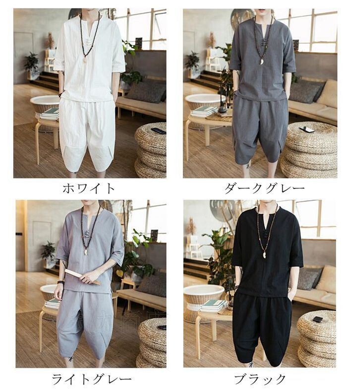 セットアップ 綿麻風上下セット リネン メンズ ワイドパンツ サルエルパンツ 上下 ルームウェア 半袖 薄手 Tシャツ パンツ 部屋着 nuol75 【品 番】nuol75