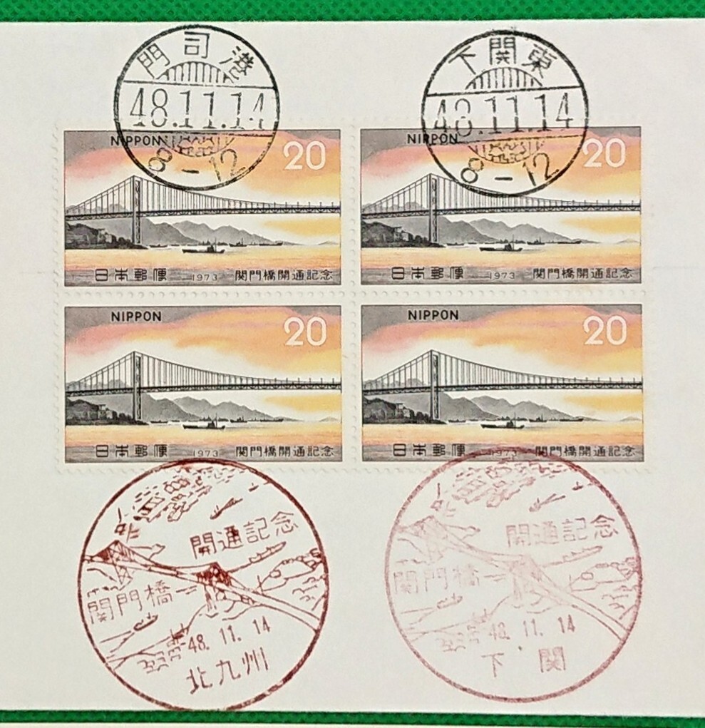 FDC/関門橋開通/初日印/北九州記念印/下関記念印/門司港,下関東和文ハト印/郵政弘済会/解説書有り/1973年11月14日/初日カバー/№4114