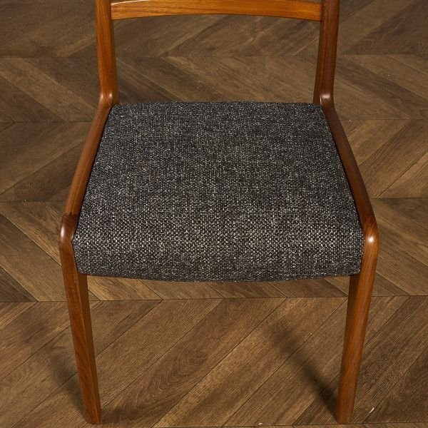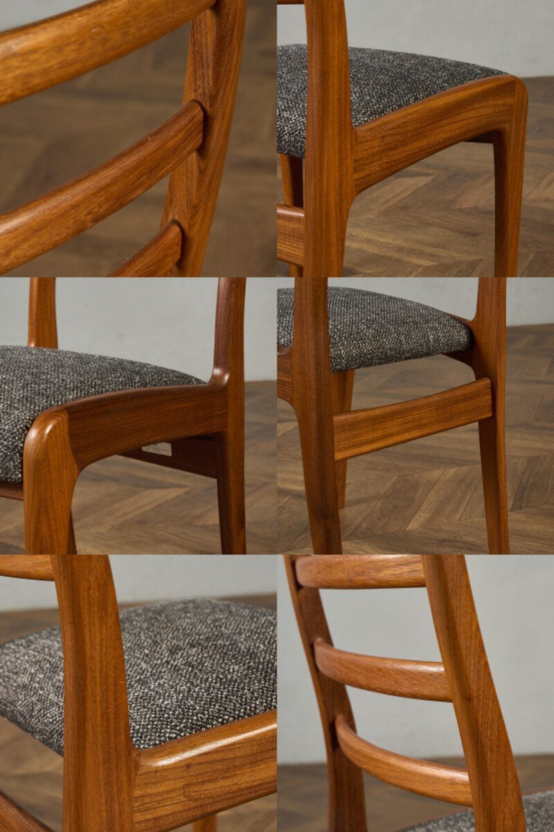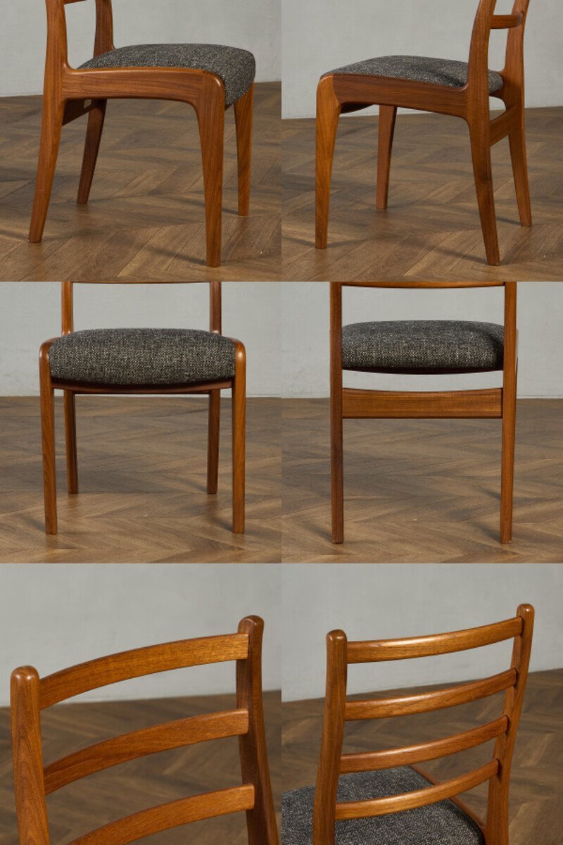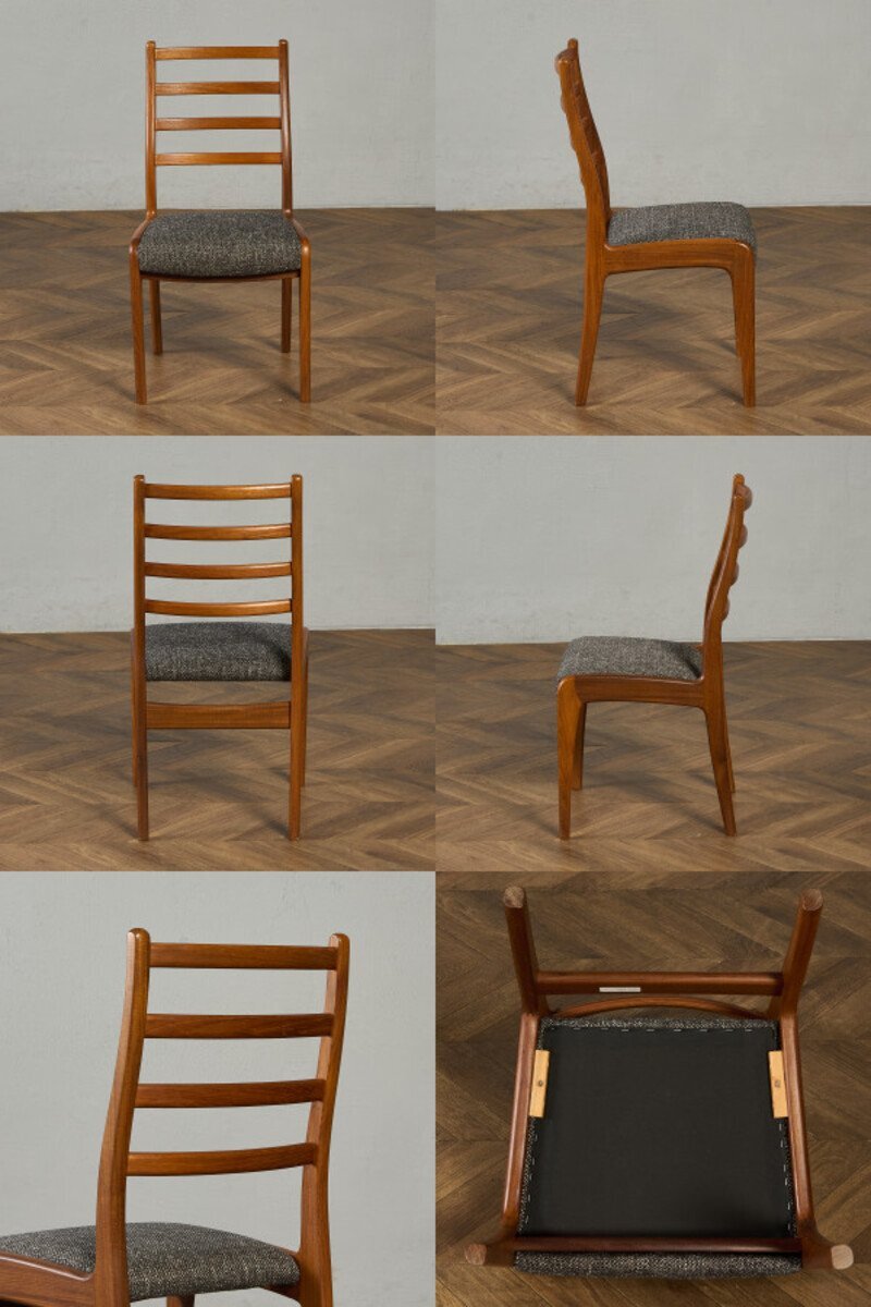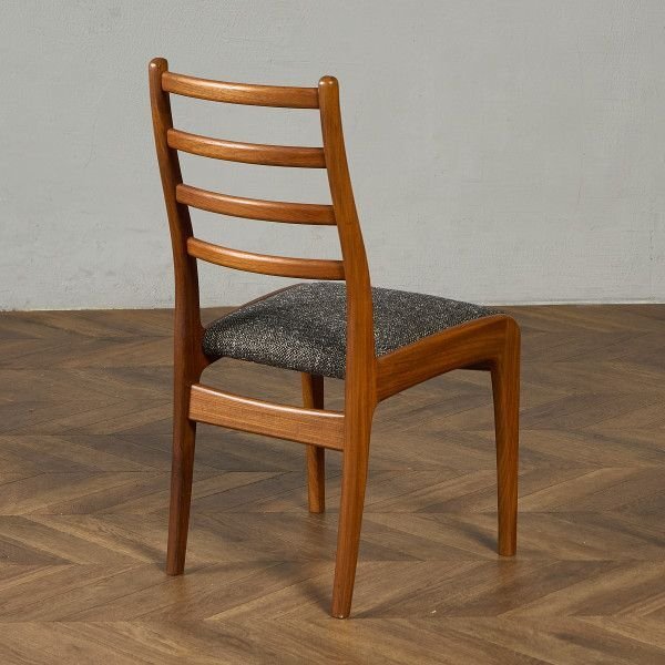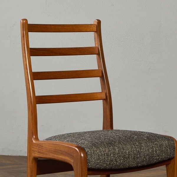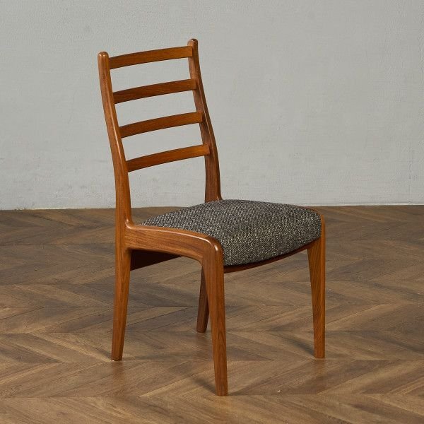 英国ミッドセンチュリーの筆頭ブランドG-PLAN(ジープラン)による、Victor Bramwell Wilkins(ビクター・ブラムウェル・ウィルキンス)デザイン、fresco(フレスコ)シリーズ ラダーバックチェア / 座面張替え済みです。 リージェンシー風の座面の左右を挟み込むようなフレームにはしご状の背もたれを備えた美しいフォルムのチェア、緩やかに曲線のついた背もたれは心地よく身体をホールドします。北欧デザインをルーツにクラシックのエッセンスを加えた独特のスタイルはG-PLANコレクションの中でも異彩。流通量も少ないレアモデルです。 約50年前に英国で一世を風靡したG-PLANの中でも最も売れたシリーズと言われている「フレスコシリーズ」1960年のDanishシリーズに続き発表当初のデザインは Ib Kofod-Larsenが手がけチーク材を用いた北欧色の強いデザインとなっています。現代においてもGプランを象徴する最も人気の高いシリーズです。 |