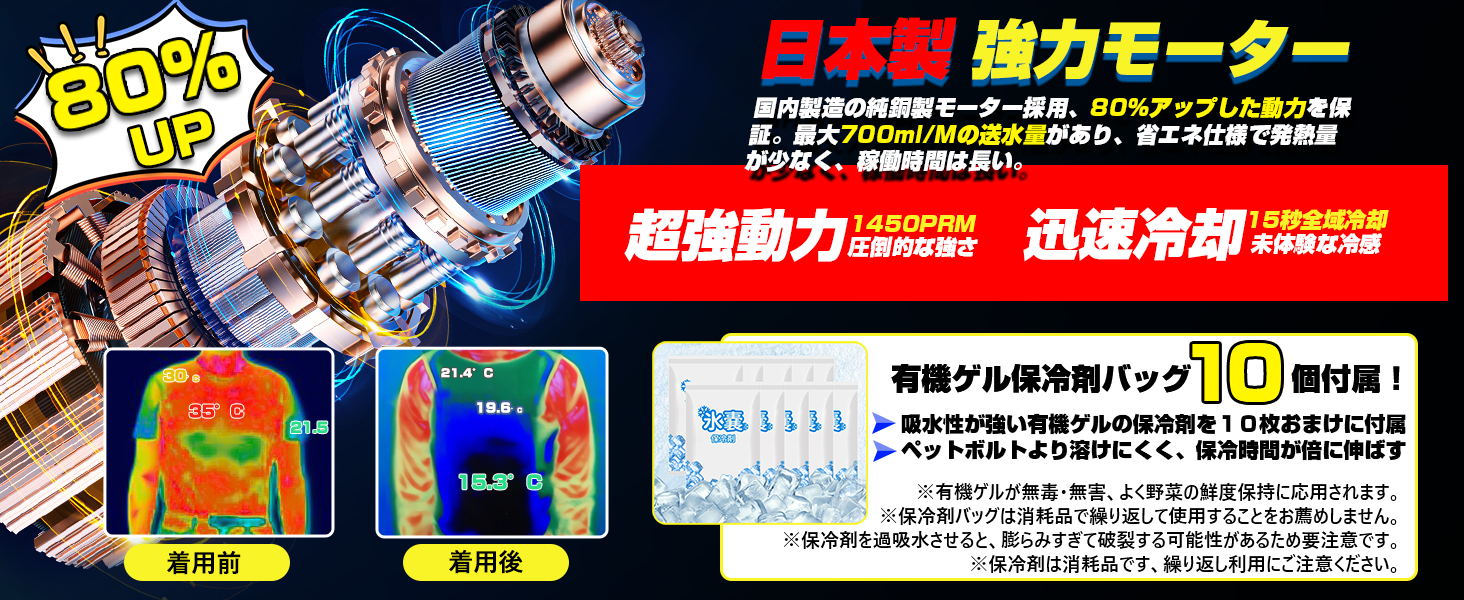 • 【『減20℃』冷却体験・全身が水に回される爽快感へ!】付属の保冷剤を適用して、冷たい水をベストの中に回す仕組みで上半身へ冷感を伝えます!着用直後で冷感が感じられて15秒ほどで体温を大幅に低減する効果があり、全身に回される冷水で炎々燃える暑さを対抗し、まさに『体の消防車』!
