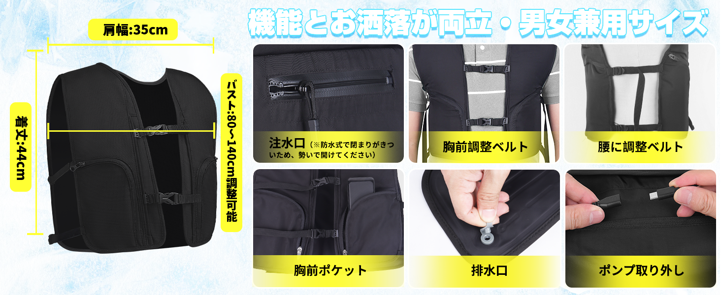 • 【冷感生地採用・薄型デザイン】冷水がなくてもひやひや感じる冷感生地を採用し、内部に空気もうまく通過できるため、蒸し暑くことなく炎熱な夏で着ても心地がよい。背中部分の厚さが貯水袋併せても僅か4~5cmの薄型デザインになってあり、上着と併せて着てもかさばらず違和感もなく、制服や作業服の下に着用するにも最適!