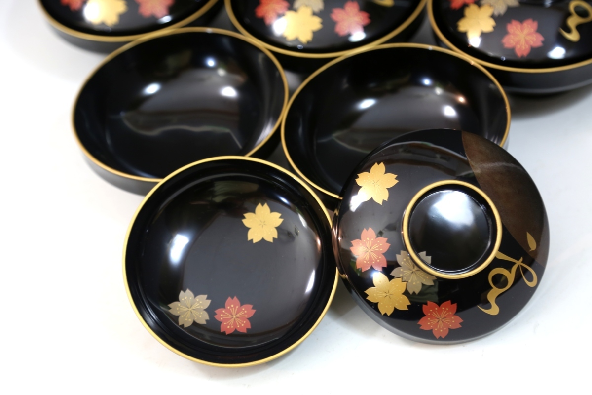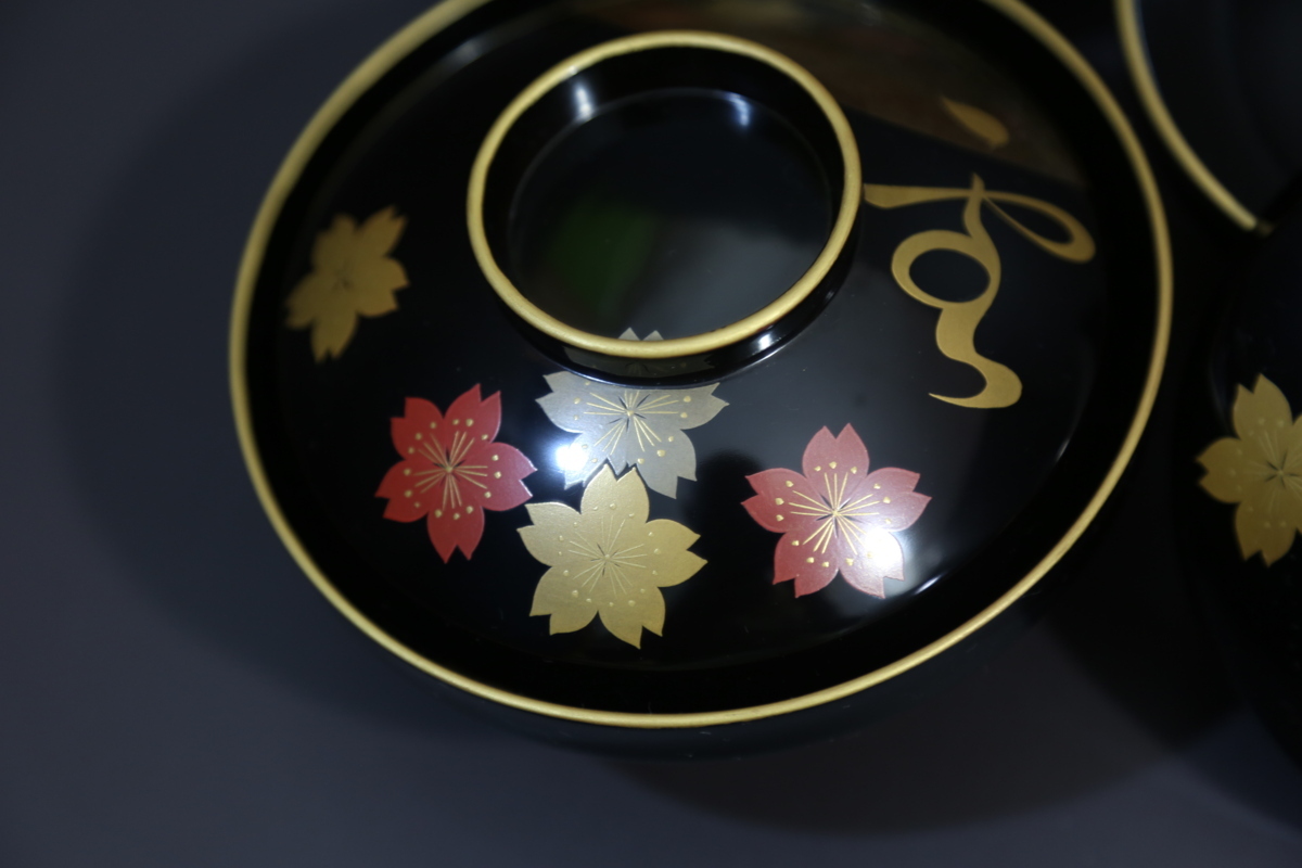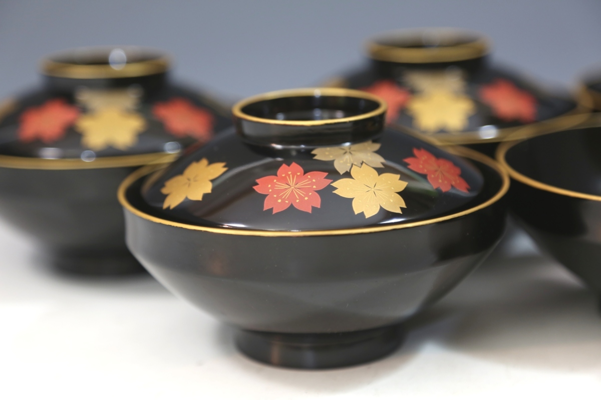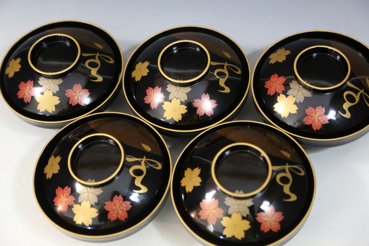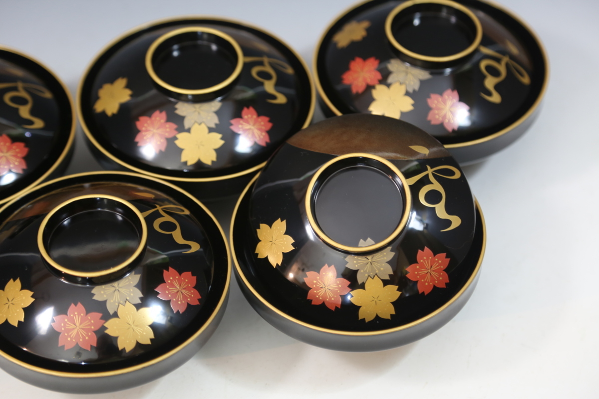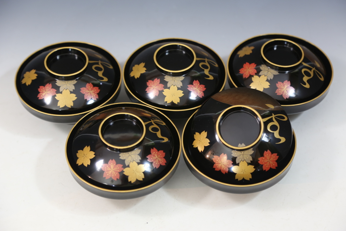 ★★★ 美品 木製 堅地塗り 鳳山作 輪島塗り 雪月花 蒔絵 吸物椀 5客 ★★★ 67