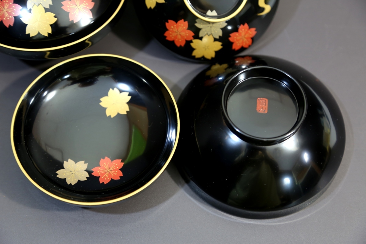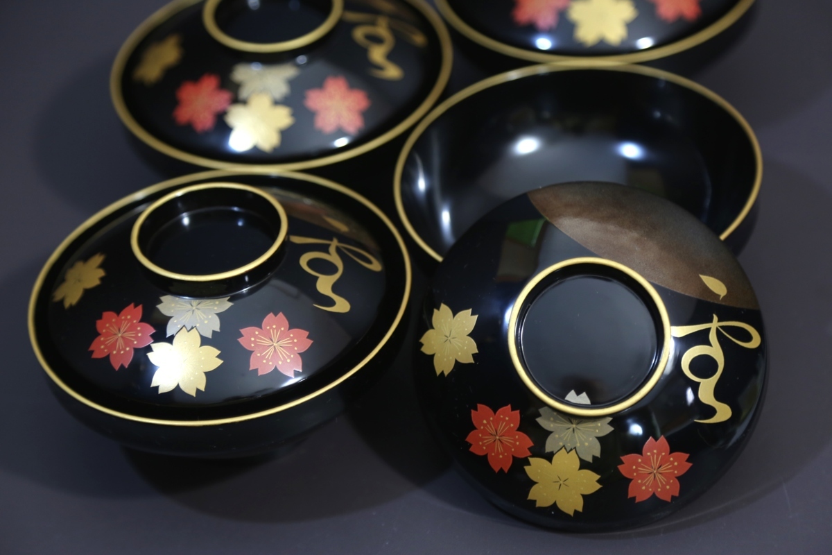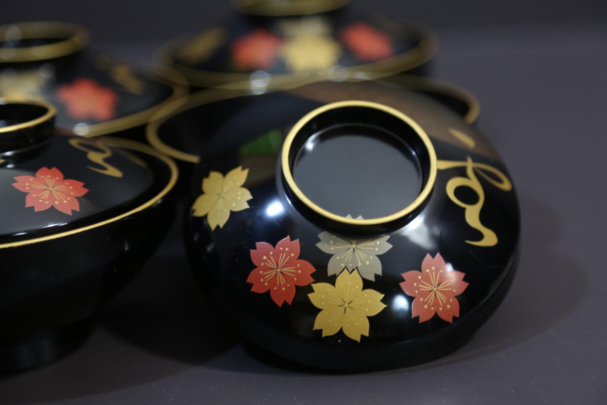 ★★★ 美品 木製 堅地塗り 鳳山作 輪島塗り 雪月花 蒔絵 吸物椀 5客 ★★★
