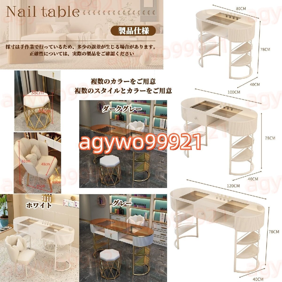1. 高級感あふれるネイルテーブルセット。広々とした天板と多層収納で作業も整理も快適。強化ガラスや環境に優しい板材を使用し、耐久性と安全性を両立。丸角デザインと安定感のあるスチール脚で安心して長時間使用可能。美容院やネイルサロンはもちろん、ホームサロンやプライベート空間にも映える理想のネイルデスクです。2. 製品名: ネイルテーブル セット、マニキュアテーブル、ネイル サロン デスク、ネイルメイク作業台、二重層収納 ネイルデスク、ネイルサロン専用テーブル、スパ ネイルデスク、勉強デスク、ワークテーブル、会議テーブル、ミーティングテーブル取り付け:簡単な組み立てサイズ:ネイルテーブル:80/100/120CM X 40CM X 78CM花びら型チェア:47 x 48 x 81cm八角形チェア:38 x 38 x 43cm材質:厳選されたEOグレードの環境に優しいパネル+強化ガラス天板+塗装仕上げの錬鉄脚カラー: ホワイト , グレー , ダークグレー利点と特徴:多層収納+引き出しデザイン/安定性と耐久性、強力な耐荷重性、変形しにくい/丸みを帯びた角、衝突防止/滑り止めフットパッド、安定性と揺れ防止/マルチシーンアプリケーション:美容院、ネイルサロン、家庭で使用でき、実用的で多用途です。3. さまざまなシナリオに適用可能ネイルサロン:お客様が座って、広々とした天板でジェルネイルやアートを丁寧に施術。収納スペースにはカラージェルやツールを整然と保管。美容院・エステサロン:待ち時間にハンドケアや簡単なネイルケアを提供し、ワンランク上のサービスを演出。ホームサロン:自宅で友人を招いて、会話しながらネイルを楽しむ。限られた空間でも収納力抜群で散らからない。化粧スペース:ドレッサーとしても活躍。コスメやアクセサリーを引き出しに収納し、毎日のメイク時間を快適に。趣味の作業台:ハンドクラフトやアクセサリー作りにも利用可能。強化ガラス天板で汚れてもサッと拭き取れて清潔。4. パッケージ内容: ネイルテーブル X1
