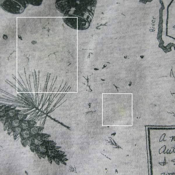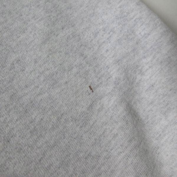 襟や袖先に擦り切れ穴、襟リブ・腹部や裾上・袖・袖先に汚れ。左袖に濃い小汚れがあります。