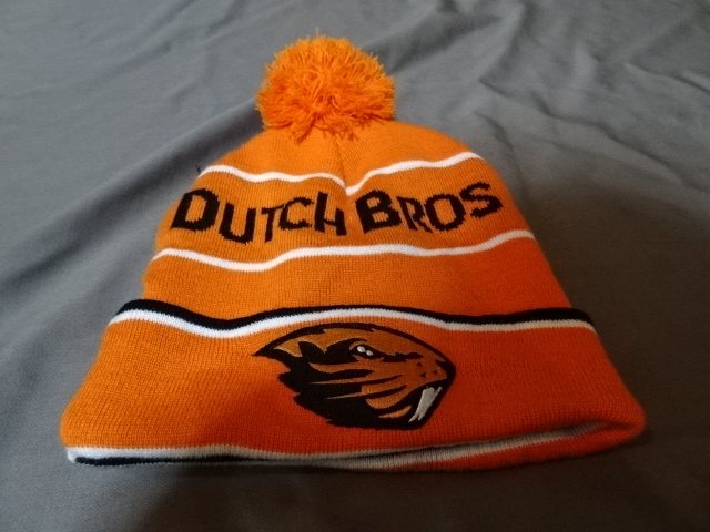 激レア USA購入USカレッジ【OREGON ST BEAVERS】x アメリカ企業モノ コーヒーショップ【Dutch Bros. Coffee】ロゴ刺繍入ニットCAP中古良品