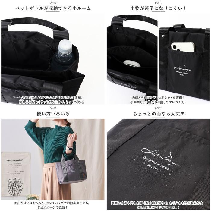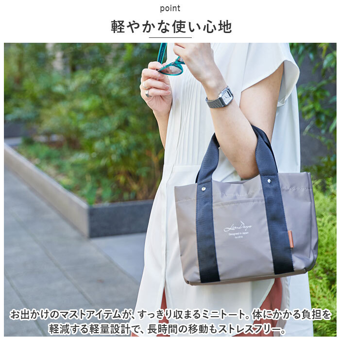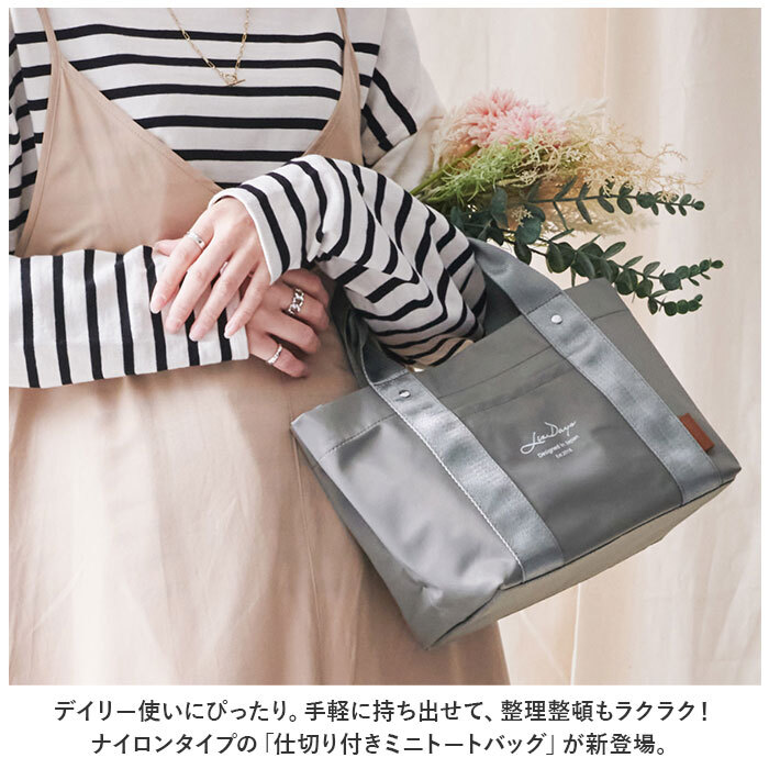 | 商品説明 | ・・デイリー使いにぴったり。手軽に持ち出せて、整理整頓もラクラク!ナイロンタイプの「仕切り付きミニトートバッグ」が新登場。 ・【大人な仕上がり】 ・サラッとした質感のナイロン素材を使用。上品な程よい光沢感があり、コーデを選ばず使える万能アイテム。 ・【軽やかな使い心地】 ・お出かけのマストアイテムが、すっきり収まるミニトート。体にかかる負担を軽減する軽量設計で、長時間の移動もストレスフリー。 ・【オープン開口】 ・開口部はガバっと開くオープンタイプ。中身が見やすく、取り出しもスムーズ。 ・【仕切り付きの3ルーム仕様】 ・内側は3ルームに分かれており、急いでいる時も中身がひと目で確認できて誰でも収納上手に♪仕切りは荷物の大きさに合わせて調節できる可動式。 ・【B5サイズ対応の大ルーム】 ・B5サイズのノートが横向きにすっぽり。長財布や本も収納OK。 ・【使い勝手の良い中ルーム】 ・ミニポーチやサニタリーグッズ、コンパクトなお弁当箱などが収まるサイズ感。 ・【ペットボトルが収納できる小ルーム】 ・ペットボトルや折りたたみ傘を縦向きに収納。倒れる心配なくサッと取り出せて、とっても便利。 ・【小物が迷子になりにくい!】 ・内側と外側に1つずつポケットを装備!移動中も、小物が取り出しやすいつくり。 ・【使い方いろいろ】 ・お出かけにはもちろん、ランチバッグやお散歩などにも。色んなシーンで活躍! ・【ちょっとの雨なら大丈夫】 ・両面に水滴や汚れを弾く撥水加工済みで、お手入れも拭き取るだけ。(※完全防水ではありません。) ・【お気に入りをチョイス】 ・コーデに馴染みやすい、落ち着きのあるカラーをラインナップ。年代問わず持ちやすいデザインも魅力。 ・【ポケット仕様】 ・内側:オープンポケット×1 ・前面:オープンポケット×1 |