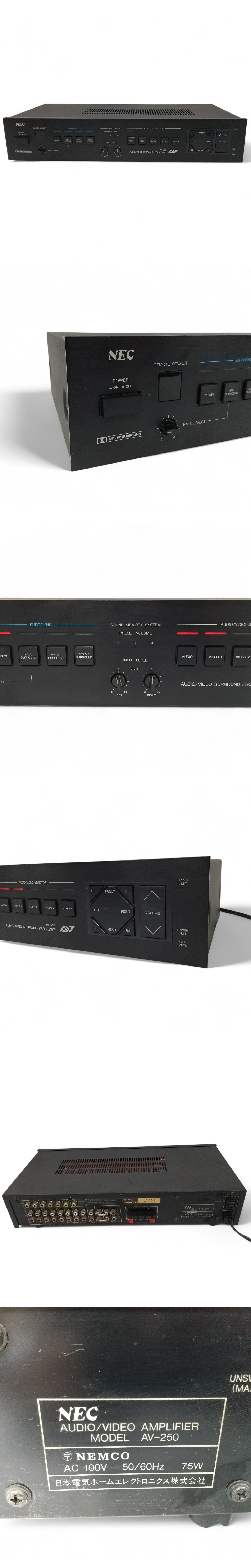 | ※必ず最後までお読みください。 Please be sure to read to the end. 一定要到最后※ | 商品概要 | 数あるオークションの中からこちらの商品をご覧頂きまして誠にありがとうございます! ※商品説明と注意事項を必ず全てお読み頂いた後にご入札下さい※ 引き続き 安心できる気持ちの良いお取引を心掛けてまいりますのでどうぞ 宜しくお願い致します! 色んなジャンルの商品を多数出品しておりますので、 こちらをクリックしてご覧ください!! ◎日本電気◎NEC AV-250 AVサラウンドプロセッサ ドルビーサラウンド・デコーダ搭載 通電確認済 即発送 ※最下部にも写真掲載中なので必ずご覧下さい。 【商品概要】 ドルビーサラウンド・デコーダを搭載したAVサラウンドプロセッサ。 通常の2ch信号に加えて(L-R)の差信号に微妙な時間遅延をかけてサラウンド情報を再生するドルビーサラウンドに対応しています。 マトリックスサラウンドとホールサラウンドの2つのサラウンド機能を搭載しています。 マトリックスサラウンドでは、左右の信号を少し混ぜ合わせた2ch信号をフロントから、リアからは逆に反対chの逆相成分を加えた信号を出す事で広がり感を増しています。 ホールサラウンドでは、通常の2ch信号をフロントから、リアからは(L+R)の複合信号にエコーをかけて再生します。 映像機器4系統の入力、オーディオ機器1系統の入力端子を搭載しています。同時に、3台までの編集が可能な出力端子、サブウーファーやセンターチャンネルの接続に便利なモノラル出力を2系統搭載しています。 フロントかリアのスピーカーを駆動できるステレオパワーアンプを搭載しいます。このアンプは独立した入力端子を搭載しており、単独で動作が可能です。 また、4ch分のプリアウト端子を搭載しており、外部アンプと接続し、全てのサラウンドセレクター及びボリュームをコントロールできます。 内蔵デコーダーが最大許容入力をオーバーすると、それを知らせるオーバーロードインジケーターが点灯します。 マスターボリューム、4モードバランス・コントロールボリューム、各チャンネル単独ボリュームの3種類のボリュームを搭載しています。 ワンタッチ・プリセット・ボリューム機能(サウンドメモリー機能)を搭載しており、好みの音量とバランスを3種類までメモリーできます。 ホールサラウンドのサウンド・エコー量を調整できるホールエフェクト・コントロール機能を搭載しています。