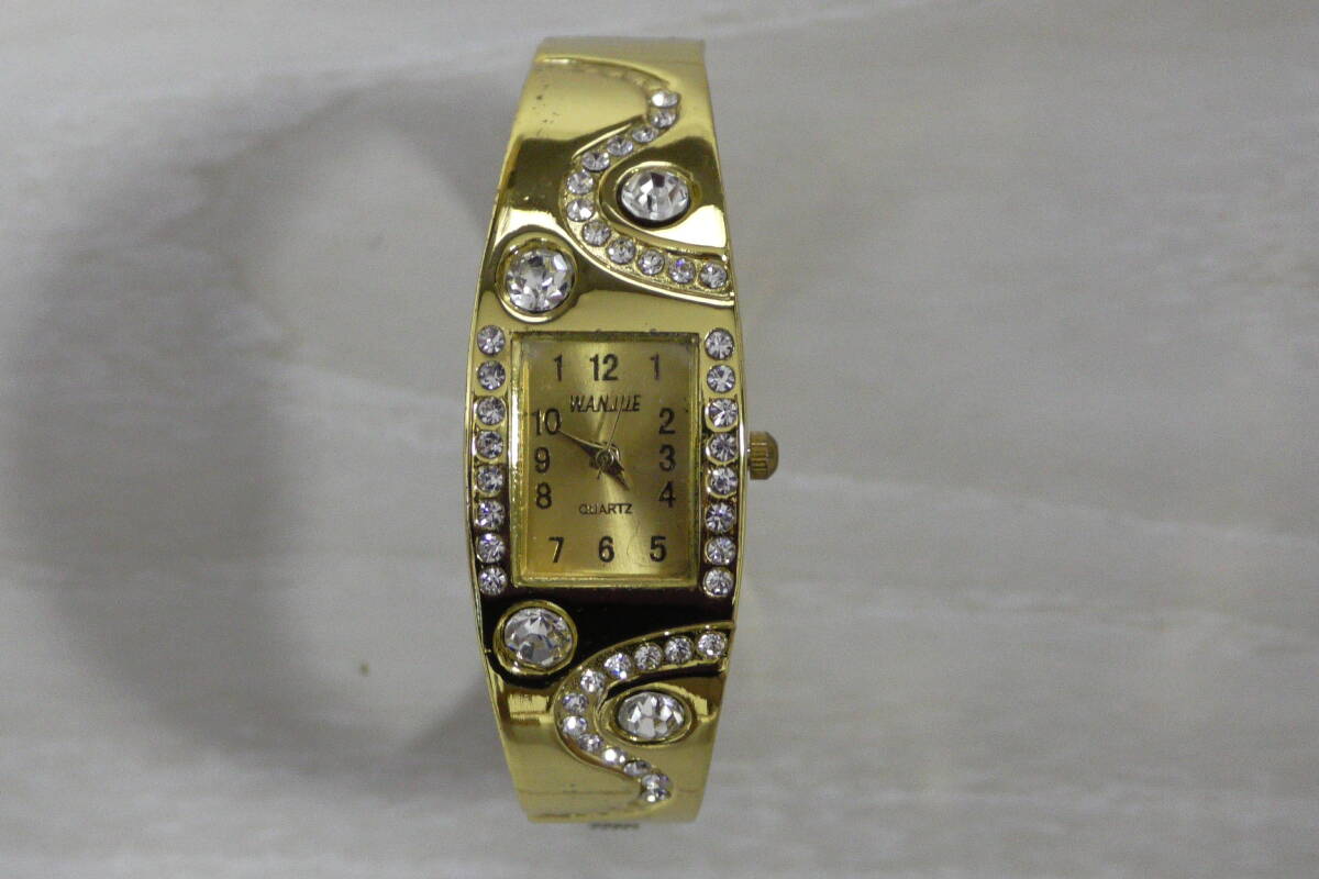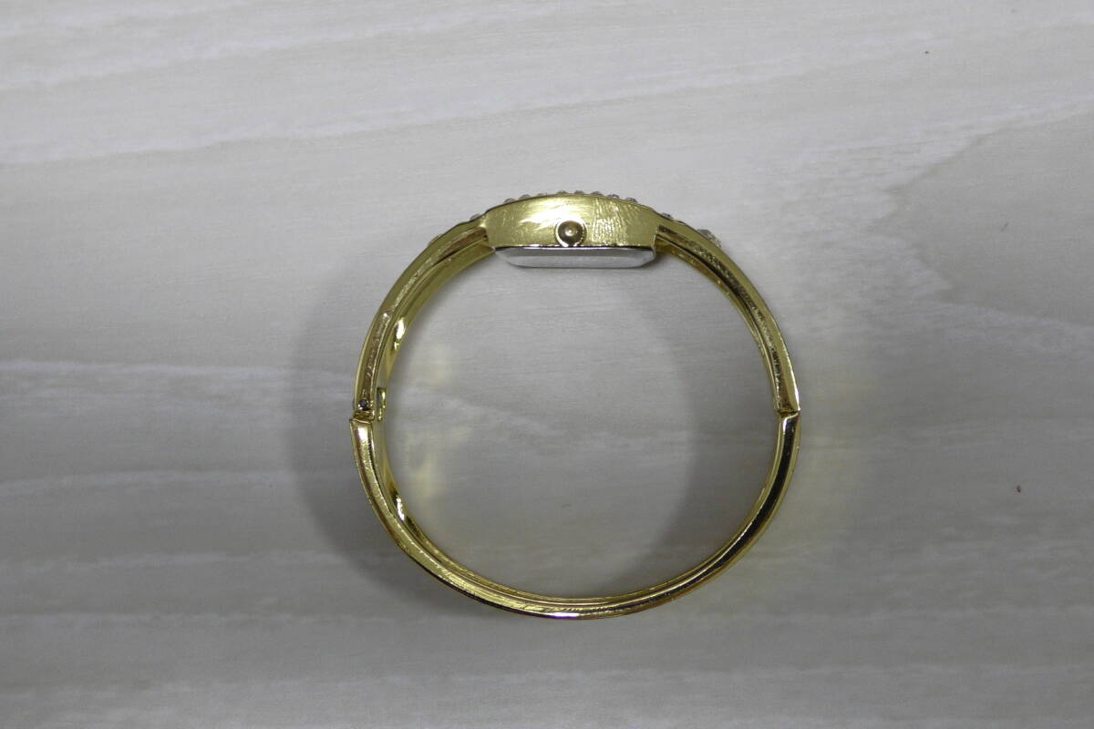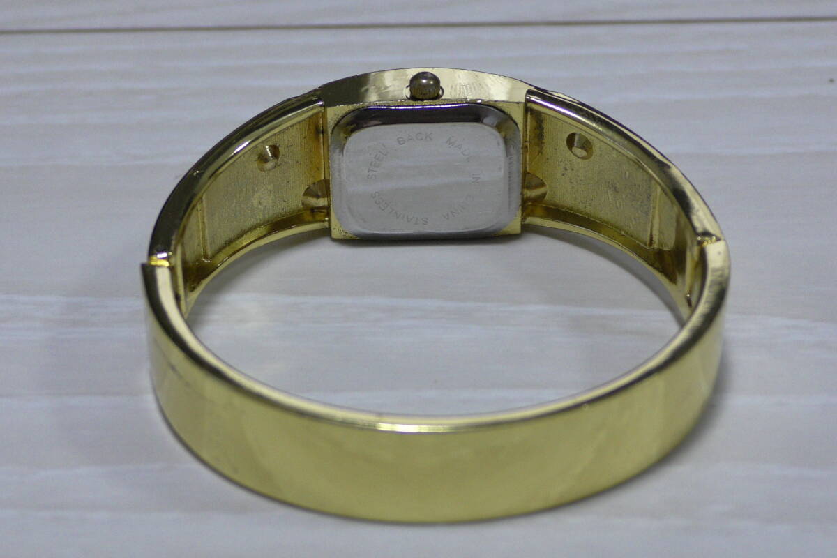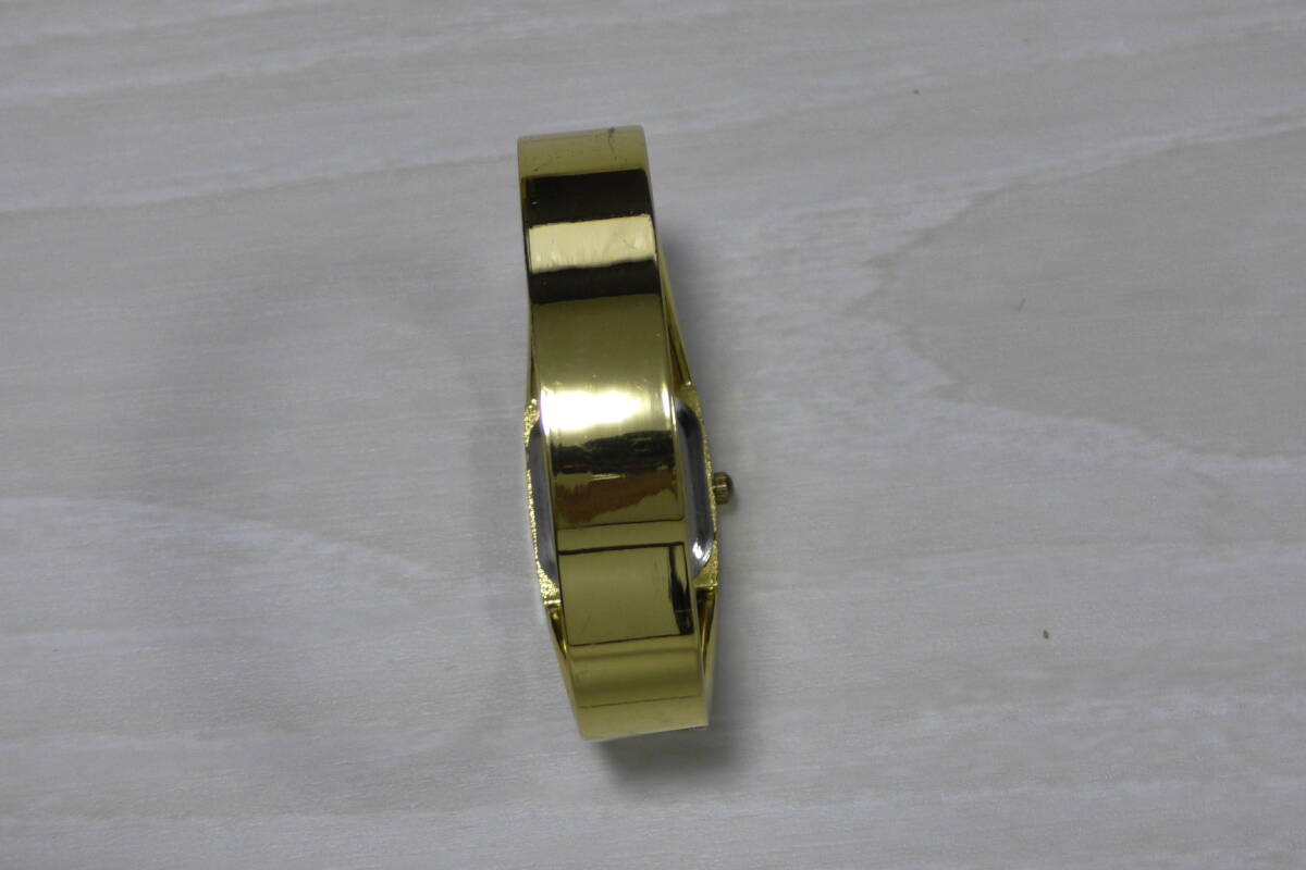 ゴールド文字盤でとにかくゴージャスな感じのレディース腕時計になるかと思います。気持ち上がるような感じがします。しっかりと稼働もしております。バンドの片側を広げて腕にするような感じになります。