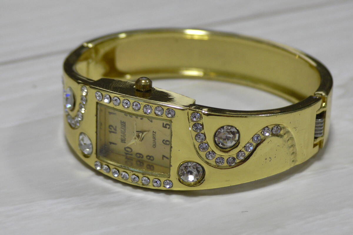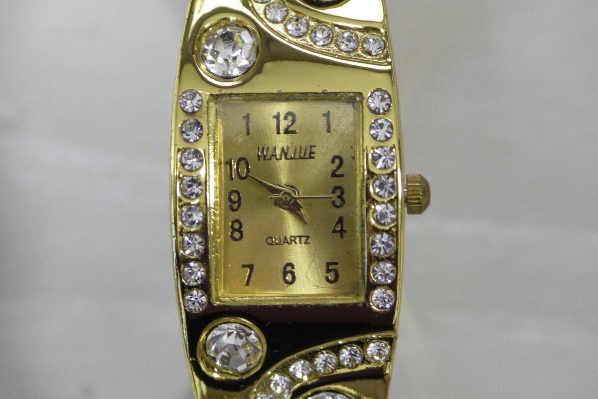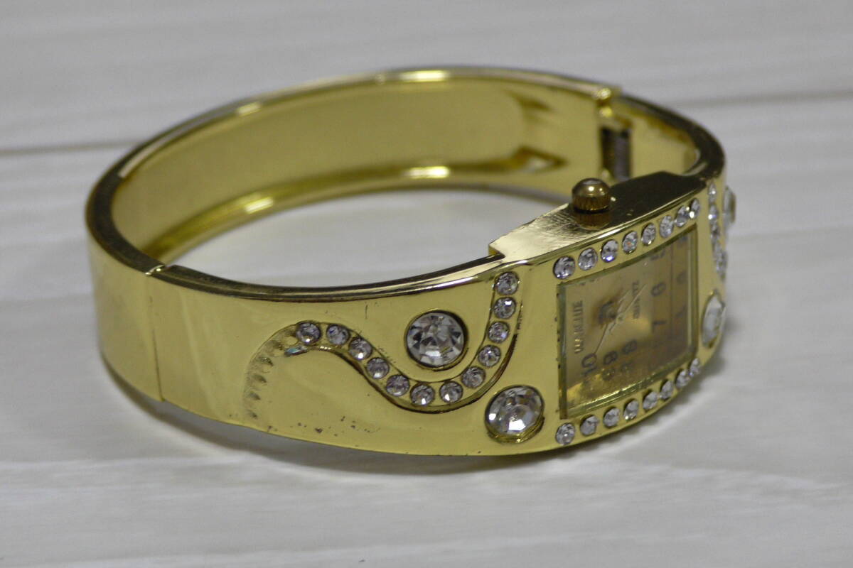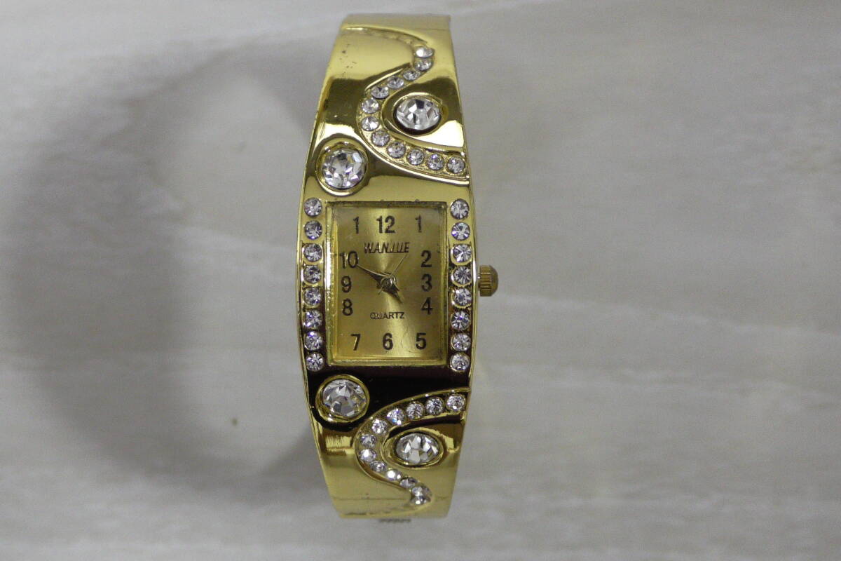 ゴールド文字盤でとにかくゴージャスな感じのレディース腕時計になるかと思います。気持ち上がるような感じがします。しっかりと稼働もしております。バンドの片側を広げて腕にするような感じになります。