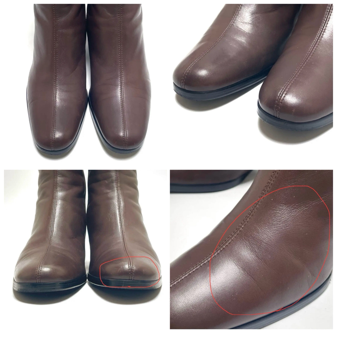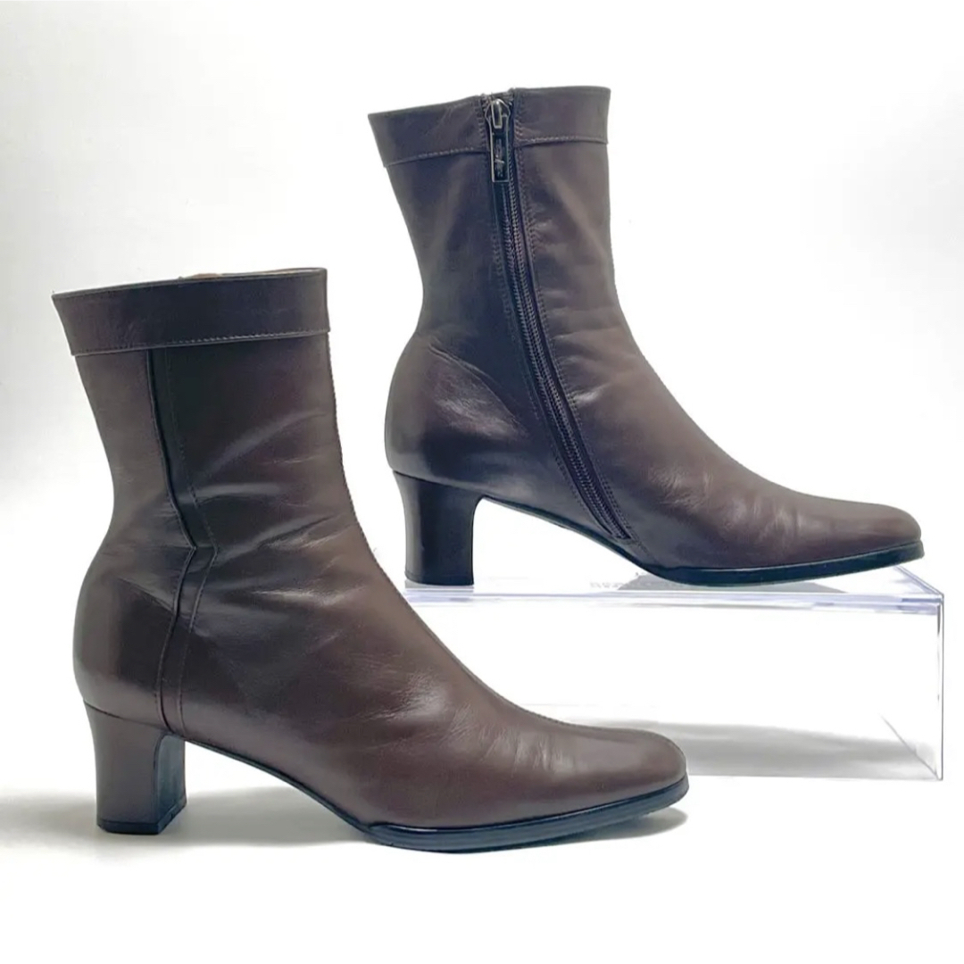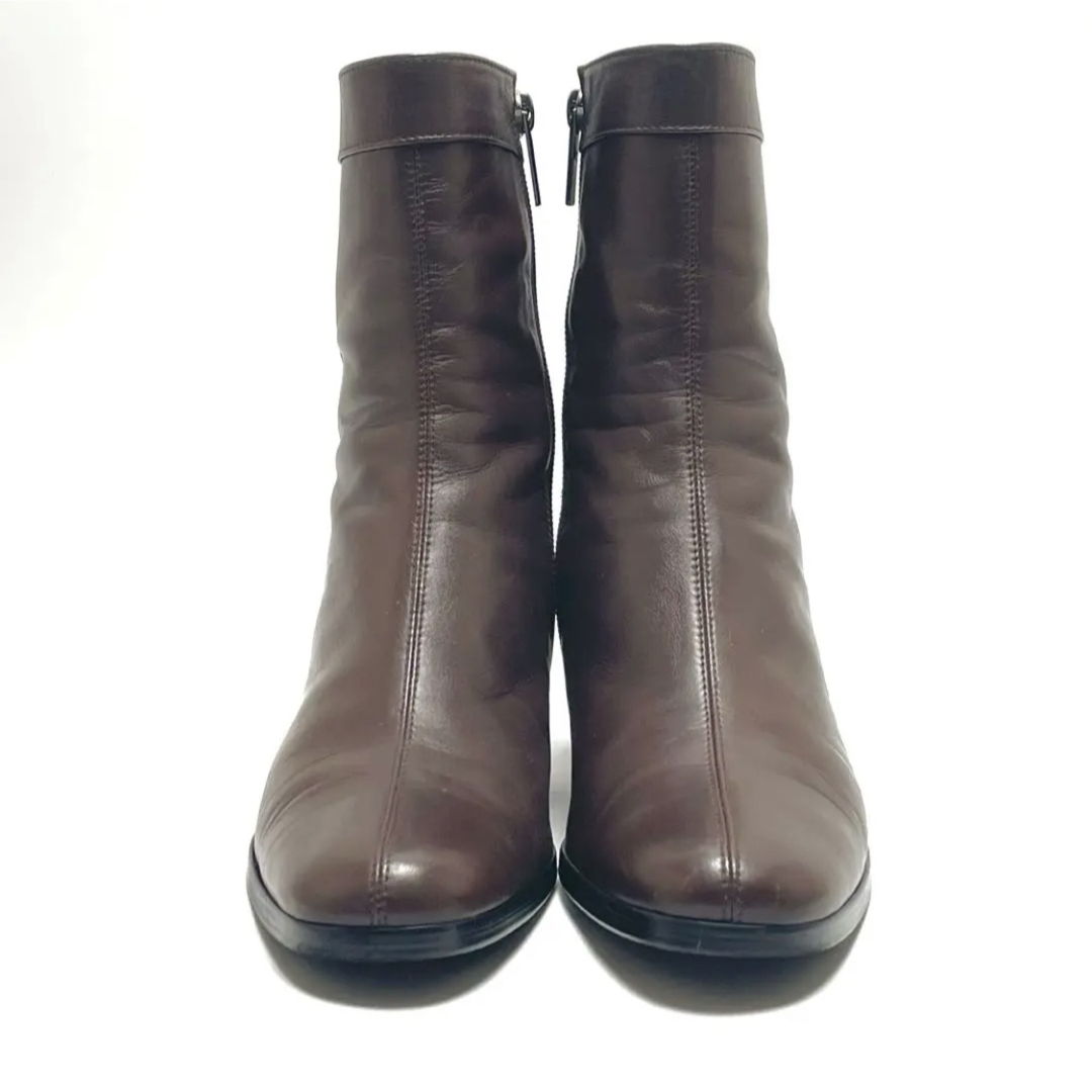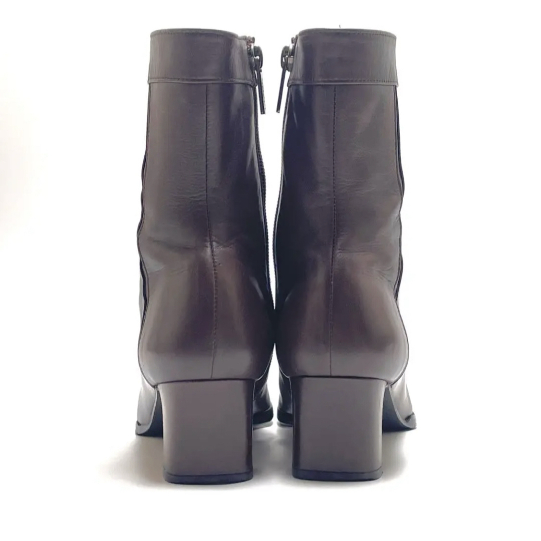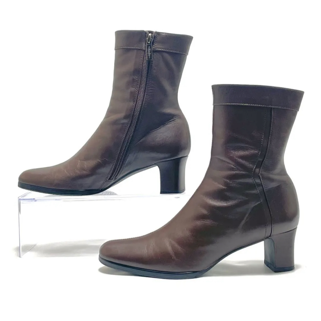 ブラウンのレザー製ジッパー付きショートブーツです。中ヒールでカジュアルにもフォーマルにも最適です♪