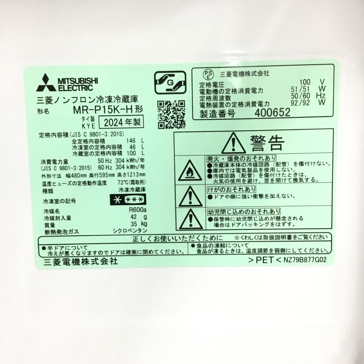 MITSUBISHI 三菱 2024年製 2ドア 146L 冷凍冷蔵庫 MR-P15K-H マットチャコール S/N00652 引き取り可 領収書発行可 【埼玉県より発送】 |