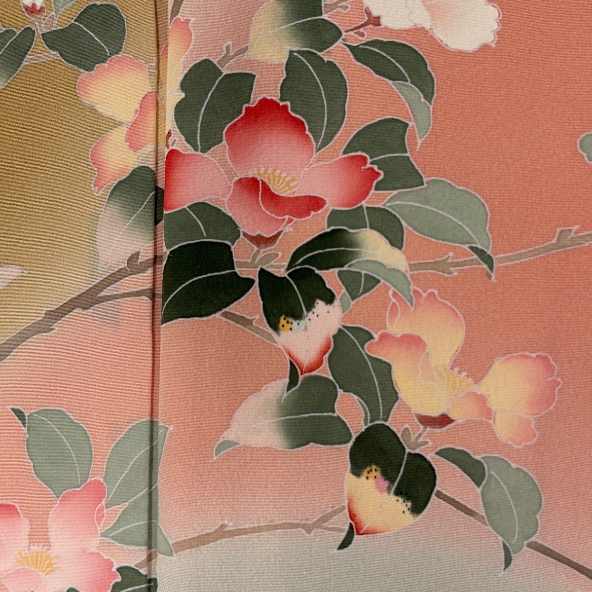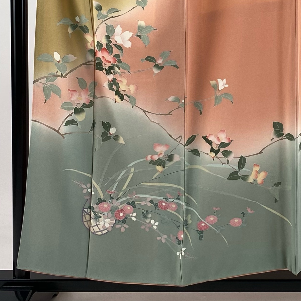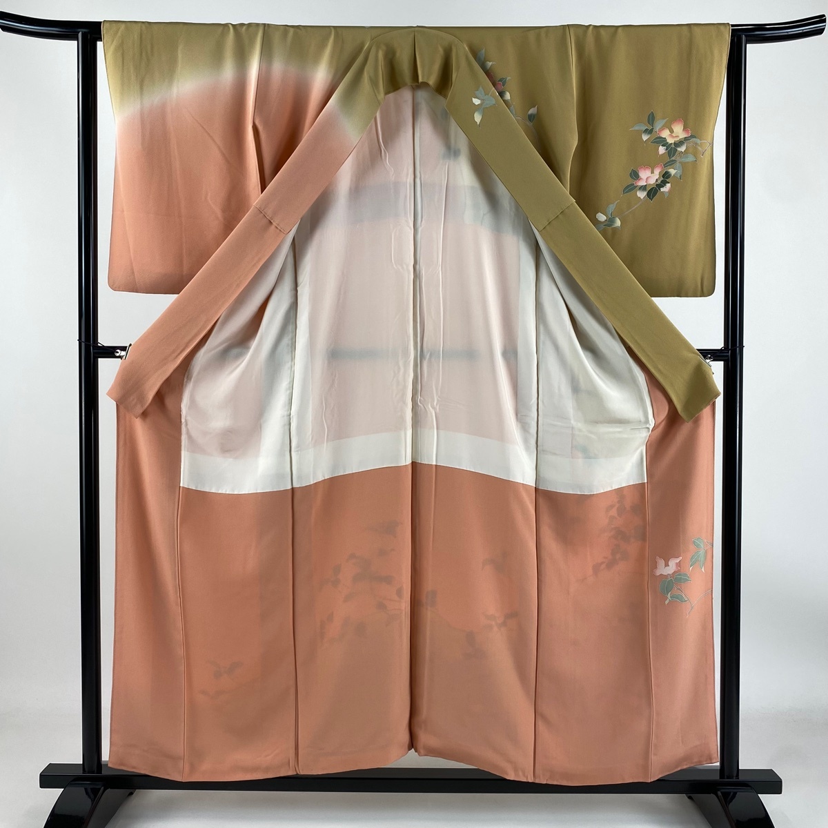 | 訪問着 秀品 落款 枝花 花籠 染め分け ぼかし 山吹茶色 袷 身丈155.5 裄丈62.5 S 正絹 【中古】 |