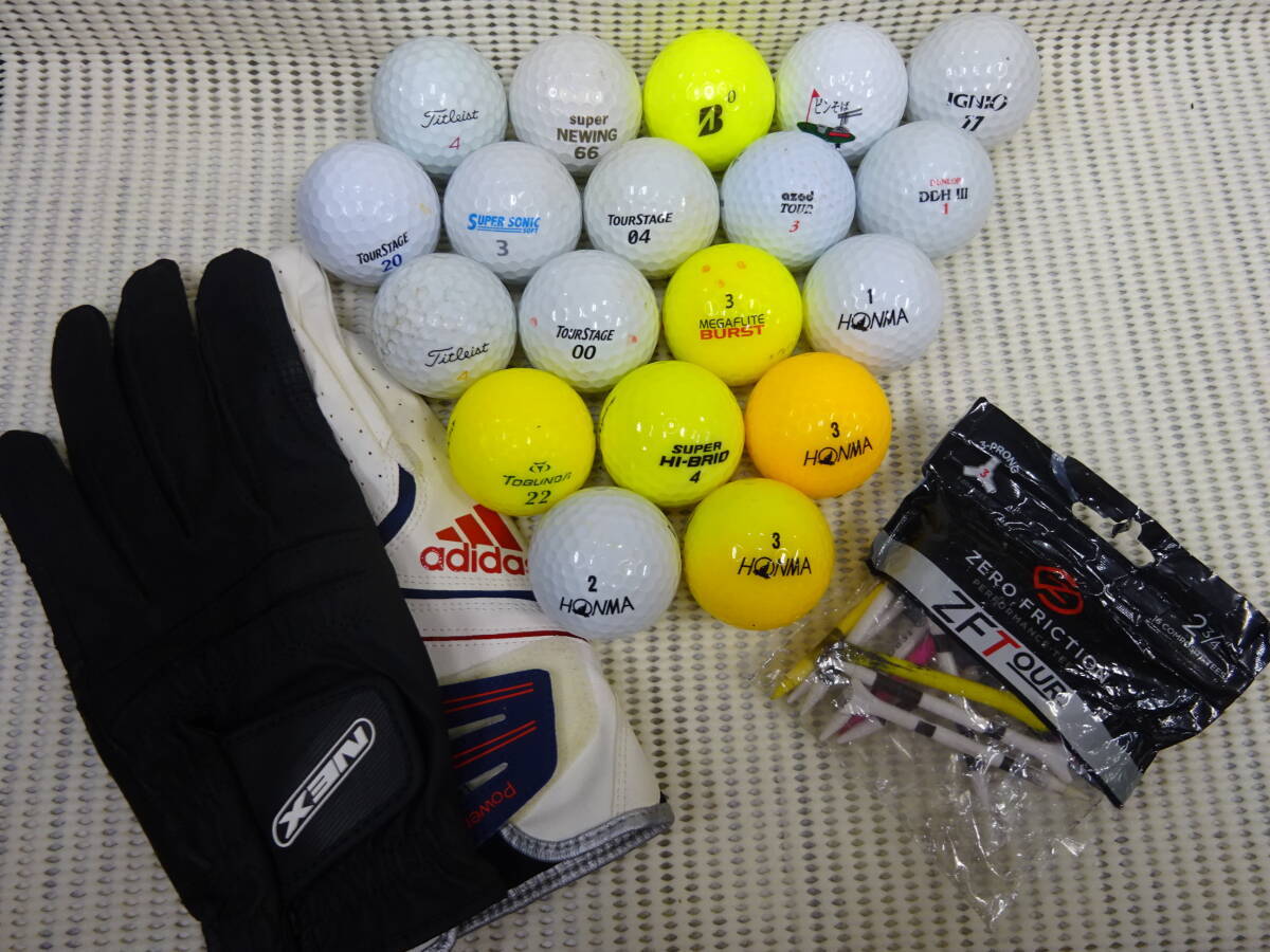 | (き-B-141)ゴルフボール ロストボール 19個 アディダス・NEX右用グローブ ピン11個 GOLF スポーツ 練習用 中古 | |