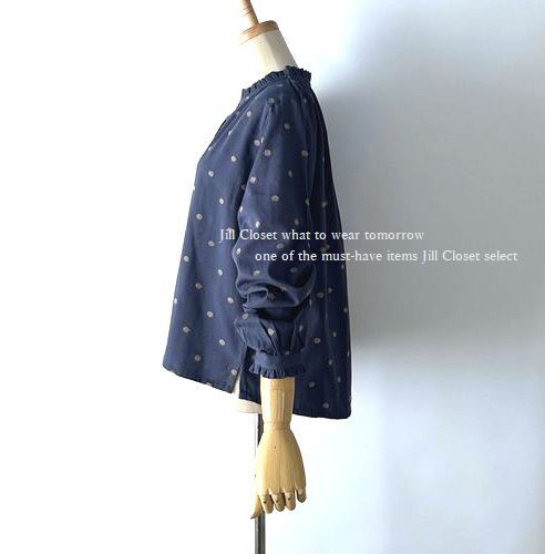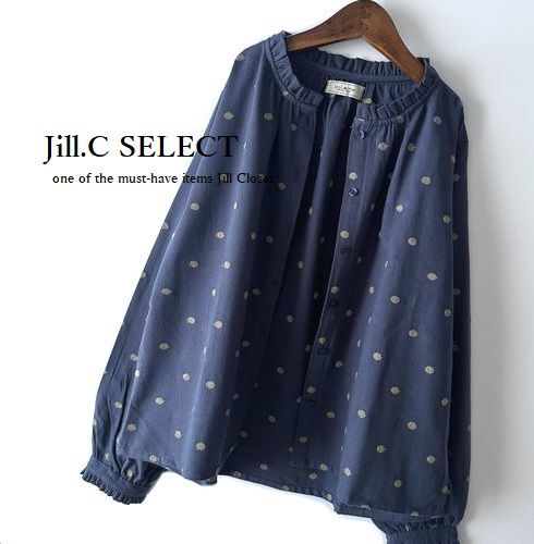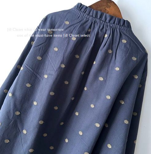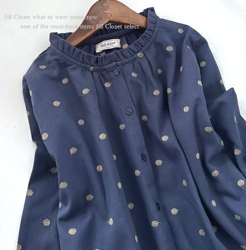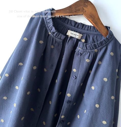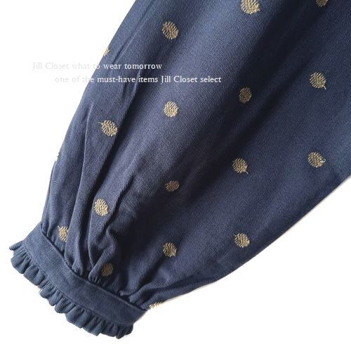 2025秋冬新作のフリルネック&ドット柄の刺繍が可愛らしいコットン素材前開きボタンシャツ。前を外して羽織としてとも使えます。ロングスカートやガウチョパンツとの相性抜群です♪