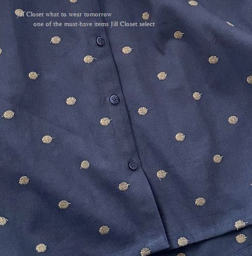 新品【送料185円】大人可愛い♪フリルネック&ドット柄 刺繍入りデザイン*前開きボタンシャツ6911.NAVY