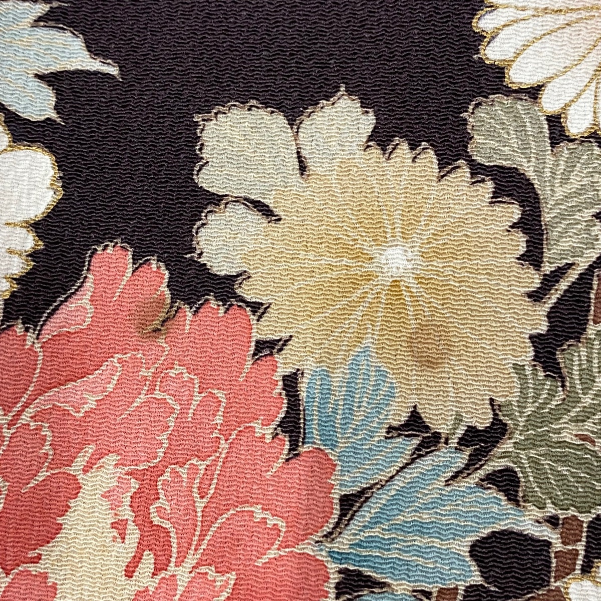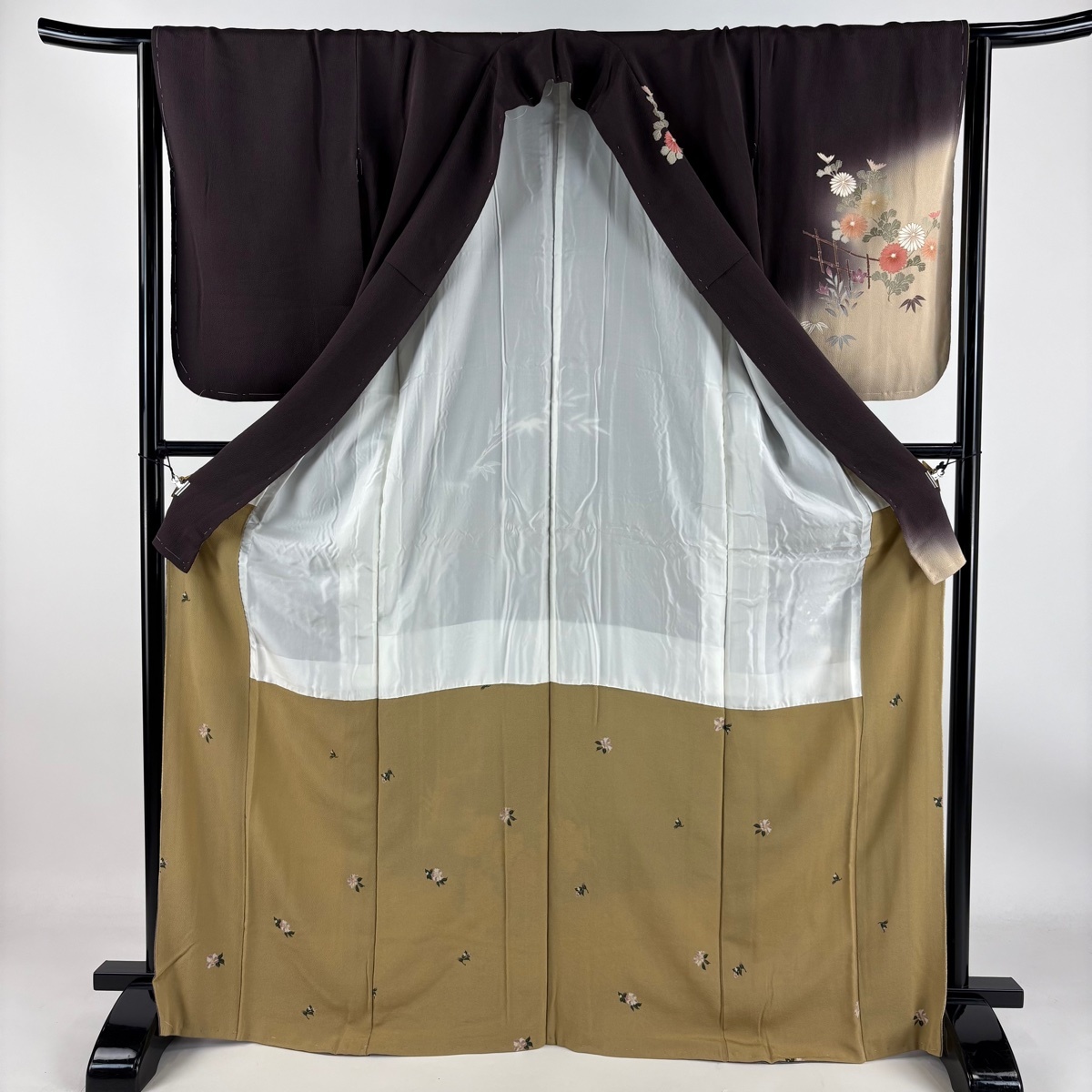 | 訪問着 秀品 牡丹 草花 金彩 縮緬 茶紫 袷 身丈168.5 裄丈66 M 正絹 【中古】 |