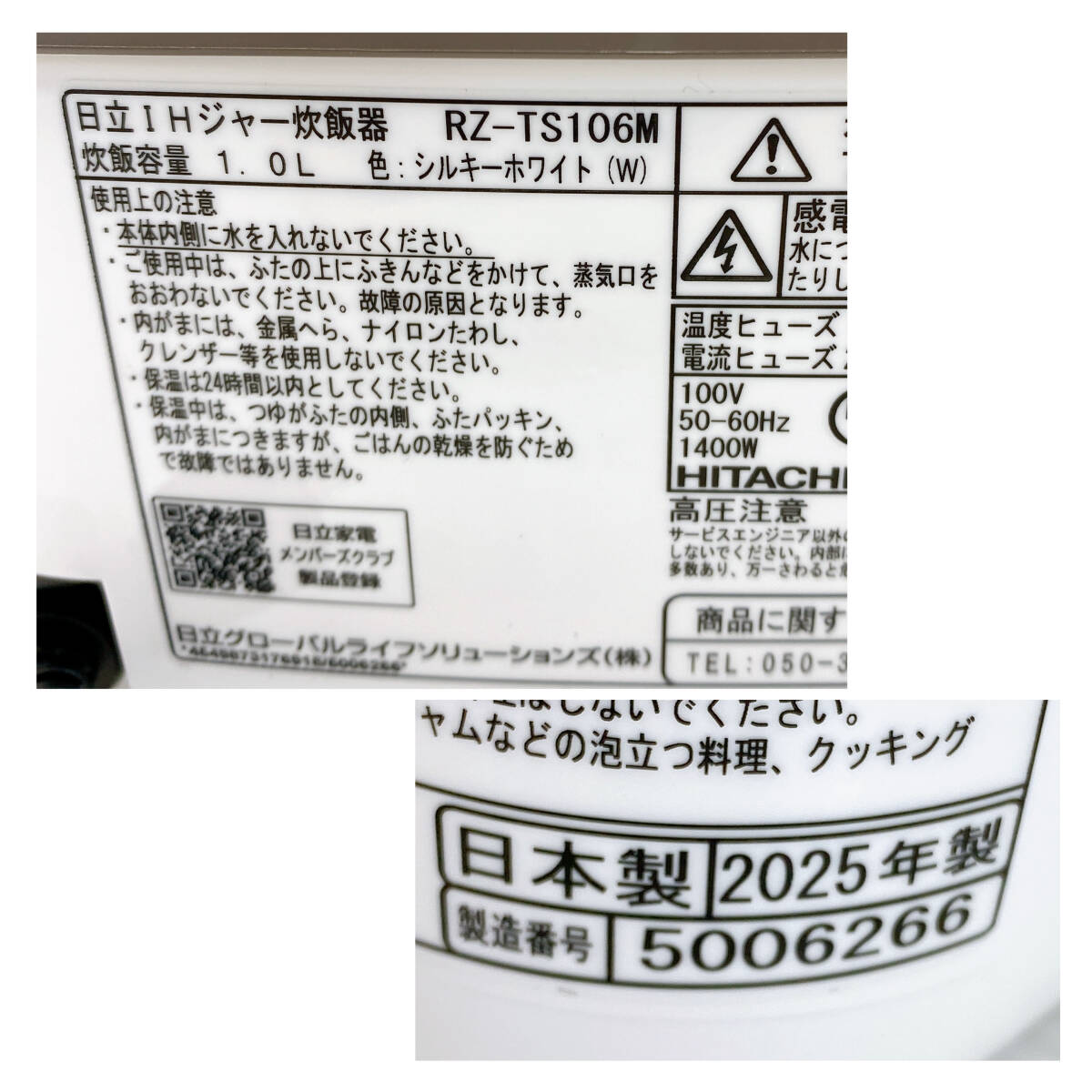 ※必ず商品詳細をご覧頂き、ご理解、ご納得頂いた上でご入札下さい。 現状品となり見落としている場合もあるかもしれません。 ご不明点、写真に写っていない箇所などご入札前にご質問お願い致します。 USED品(中古品)とご理解の上でご入札お願いします。 完璧なものを求める方のご入札はご遠慮願います。 □メーカー:HITACHI □品名:5.5合炊き圧力IH炊飯ジャー □型番:RZ-TS106M □年式:2025年 □付属品:箱、軽量カップ □管理番号:【MTD25-1532】N【258】 □商品詳細 浸し・火力・蒸らしの工程にこだわった「圧騰甘み炊き」採用のIHジャー炊飯器(5.5合)。土鍋で炊いたお米のような粒立ちを実現。 米料亭「八代目儀兵衛」が監修し、「外硬内柔」の炊き上がりを実現した「極上コース」を搭載。「少量炊きコース」で食べたいぶんをおいしく炊ける。 最大24時間の保温機能を備え、スチームを発生させてパサつきを抑えごはんをしっとり保つ。玄米や雑穀米も圧力とスチームでおいしく炊ける。 1.2回程度の使用でとてもきれいな状態です。 ※状態評価など個人主観となりますので、画像にてご判断ください。 動作確認済み。 □コンディションランク□ ☆CONDITION A☆ ☆Nランク【新品】:全く使用しておらず、タグ付きのものや箱モノであれば未開封などの付属品が完備されているもの ☆Sランク【未使用品】:展示品、新古品など付属品の有無は場合によるが、未使用の状態であるもの ☆Aランク【美品】:中古品であるが、ほとんど使用された形跡もなく大切に扱われていたであろう物 ☆Bランク【程度良好】:中古品の為、細部には傷や汚れ等ありますが、程度良好な物 ☆Cランク【一般中古品】:中古品の為、使用感、傷や汚れ等がありますが、一般的な中古品 ☆Dランク【現状販売】:通電確認のみの商品、完全な動作確認ができない商品です ☆Jランク【ジャンク品】:著しい破損が見られる場合や、原型をとどめていないもの ※部品取りや、修理できる方にオススメ ※ジャンク表記のあり商品は、一切のクレーム・返品をお受けいたしません 【注意事項】 ☆あくまでも当店における基準となっております、お客様が入札をご検討される場合に参考になればという考えの基に設定させて頂いております。 ☆中古品の状態に関して評価基準が著しく繊細な方・神経質な方はご入札をお控え下さい。 ※注意※ 当商品は店頭での同時販売もしている為、多少の時間差により商品が売り切れている可能性がございます。その際には大変申し訳御座いませんが出品取り消し又はお取引キャンセルさせて頂きます。どうぞご了承下さい ★商品到着より一週間以内での不具合にはご対応させて頂きます。 ★商品はデジタルカメラで撮影しておりますので、色合いが多少異なる場合がございます。予めご了承下さい。 ★商品は写真に写っている物がお渡しする物全てになります。 (商品詳細と写真で異なる付属品がある場合や不明な点が有りましたら、質問欄にて質問お願いします。) ★ジャンク品、ジャンク扱いの記載がある商品はいかなる場合もノークレーム・ノーリターンでお願いします。 ★中古商品は、全ての機能・状態を記載出来ませんので、写真・商品詳細は参考程度にお考え下さい。 ★当商品は店頭での販売もしている為、店頭販売時には出品取り消し又はお取引キャンセルをする場合がございます。 ★落札金額+送料、振り込み手数料のみご負担下さい。 | |||