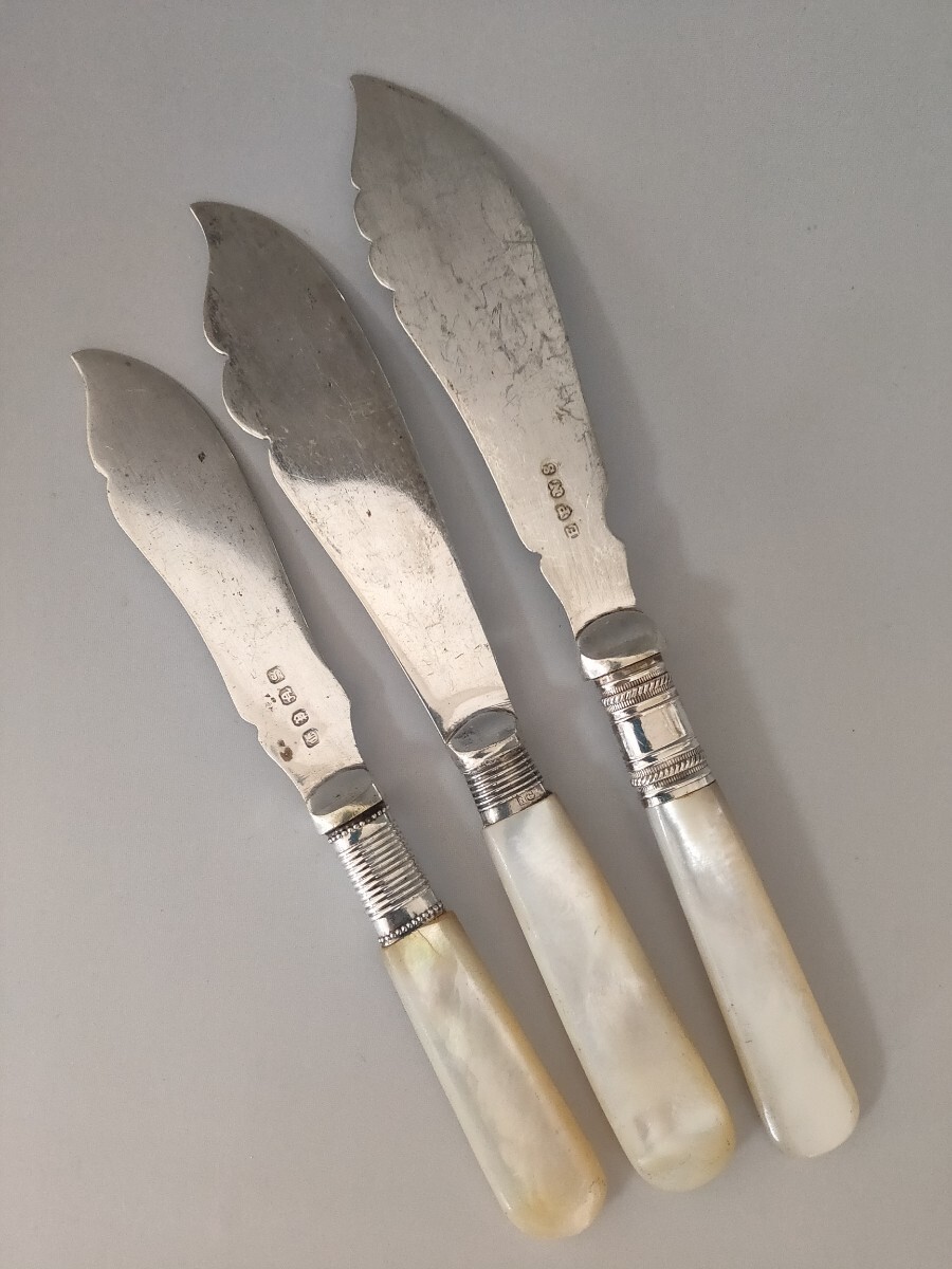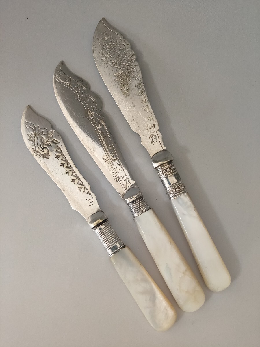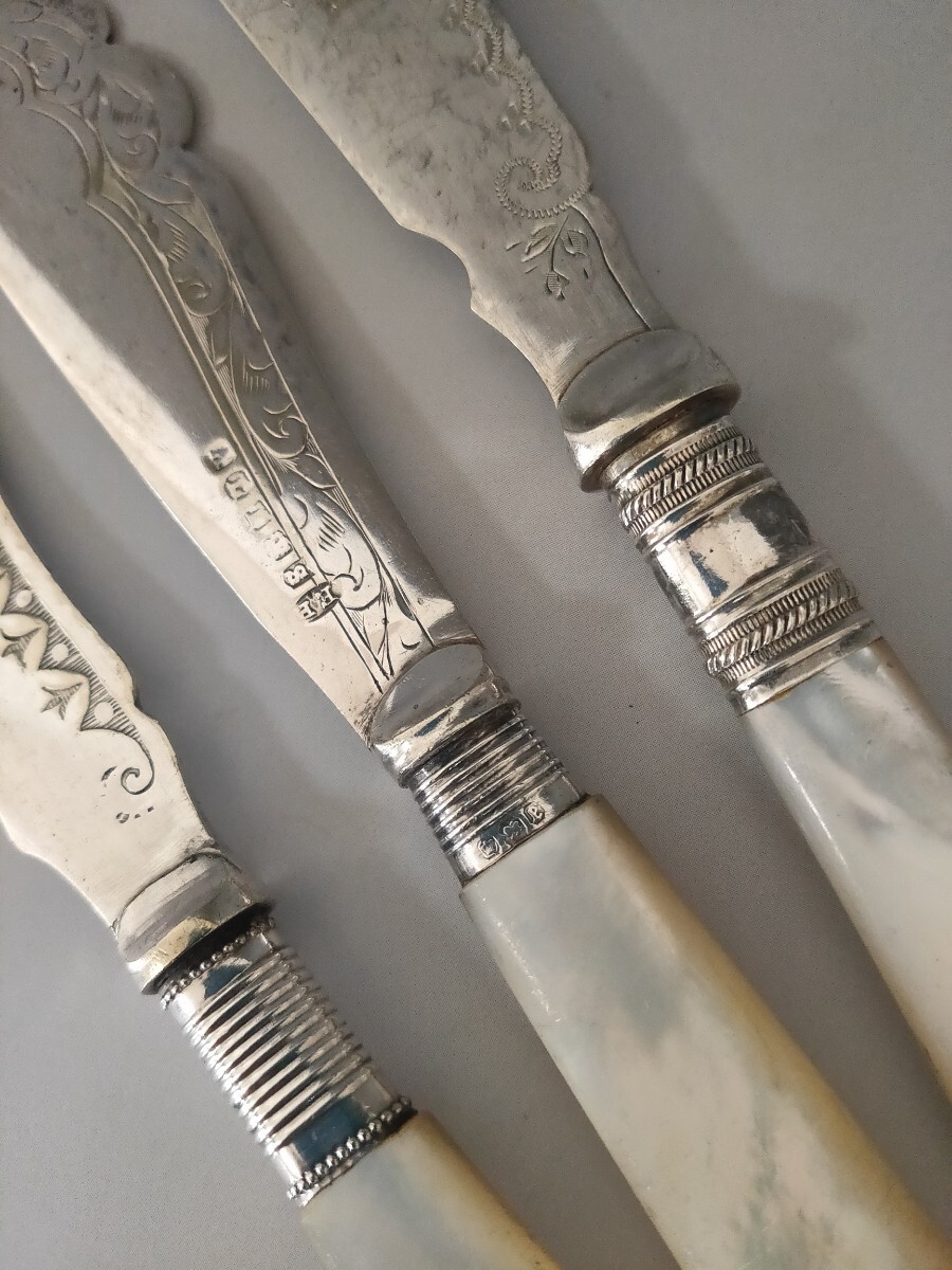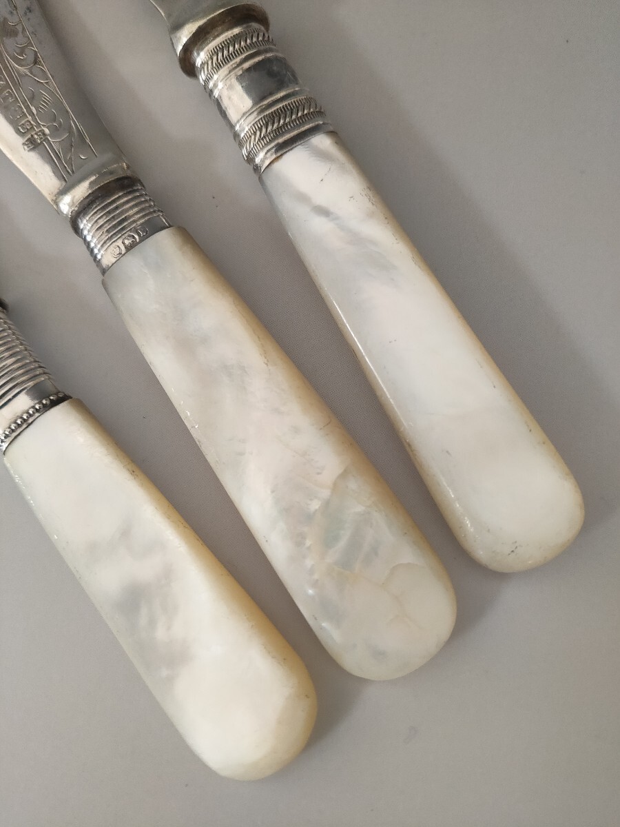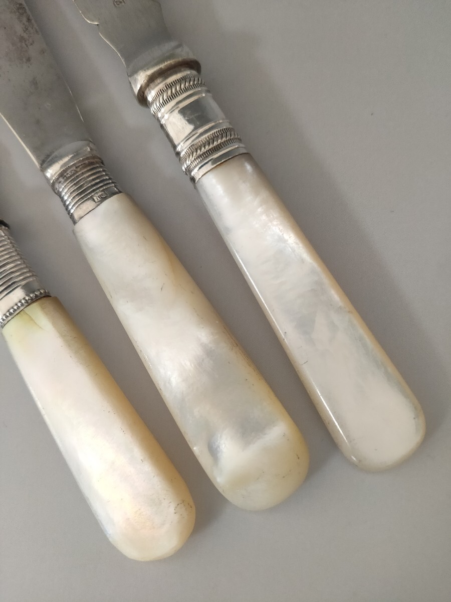 ☆★希少★☆ 英国製アンティーク 白蝶貝ハンドル シルバープレート ナイフ 3本set マザーオブパール MOP ヴィンテージ (L11.①c)