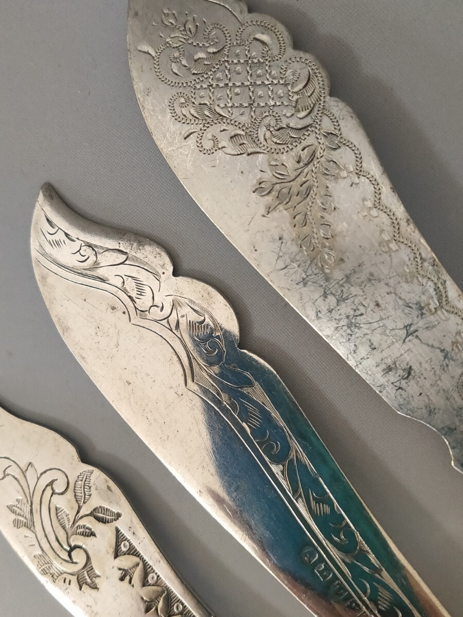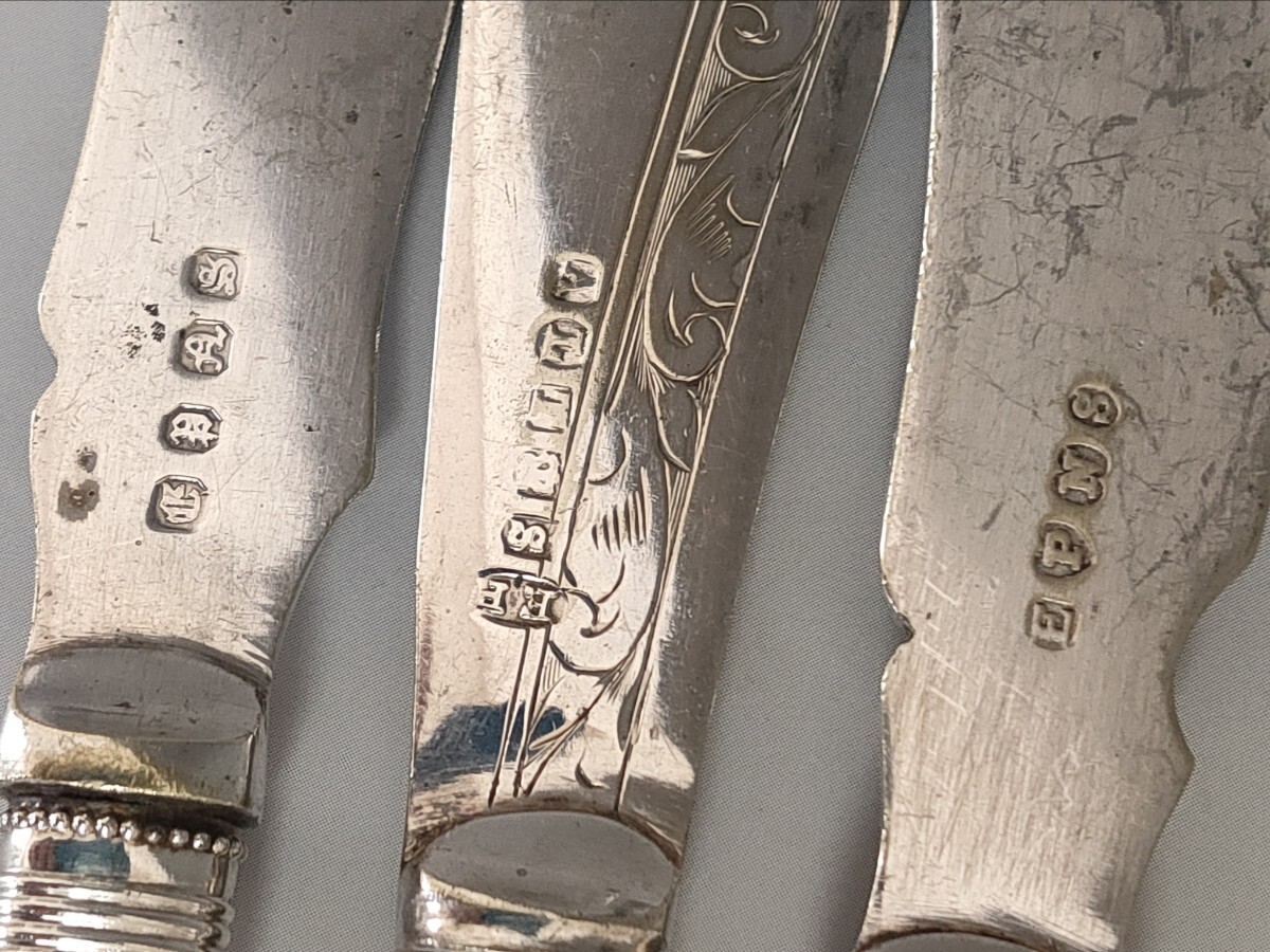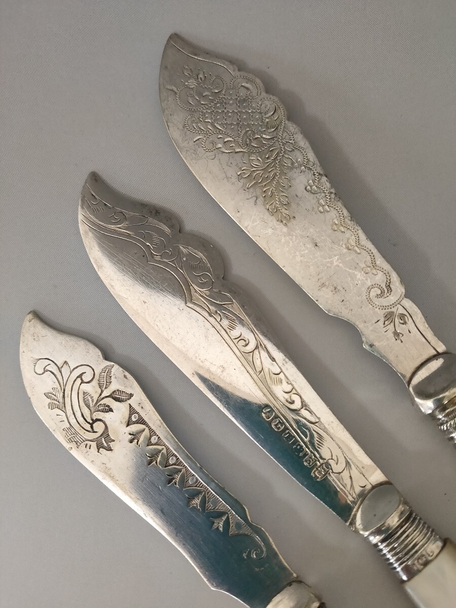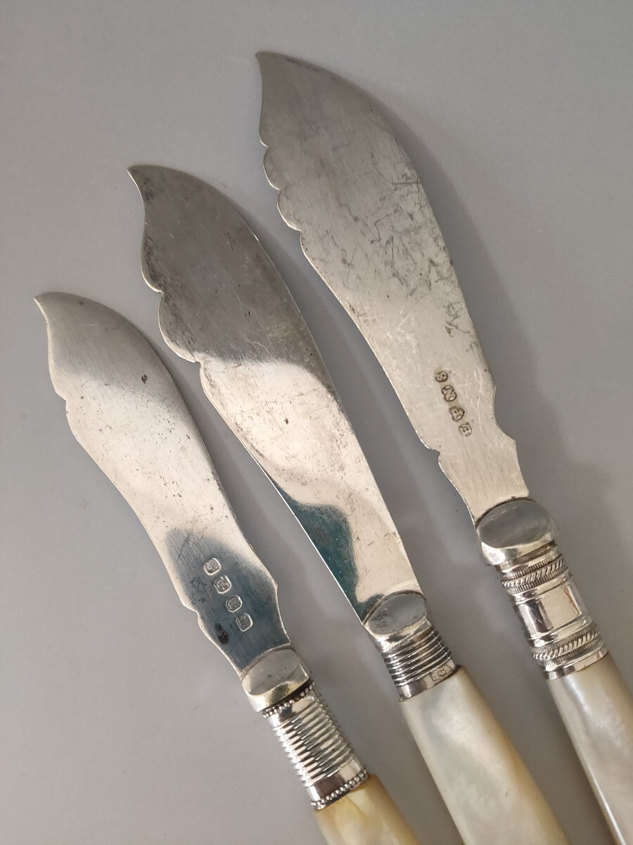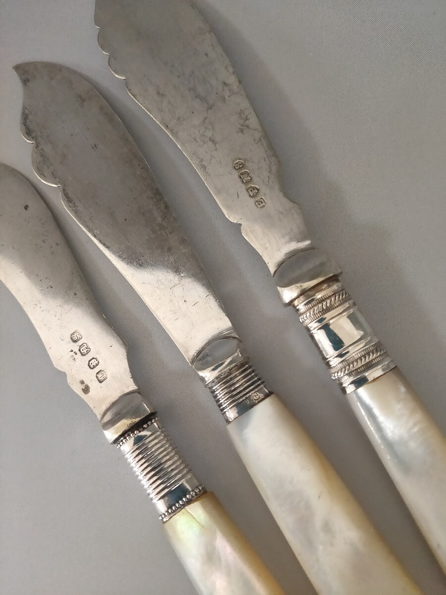☆★希少★☆ 英国製アンティーク 白蝶貝ハンドル シルバープレート ナイフ 3本set マザーオブパール MOP ヴィンテージ (L11.①c)