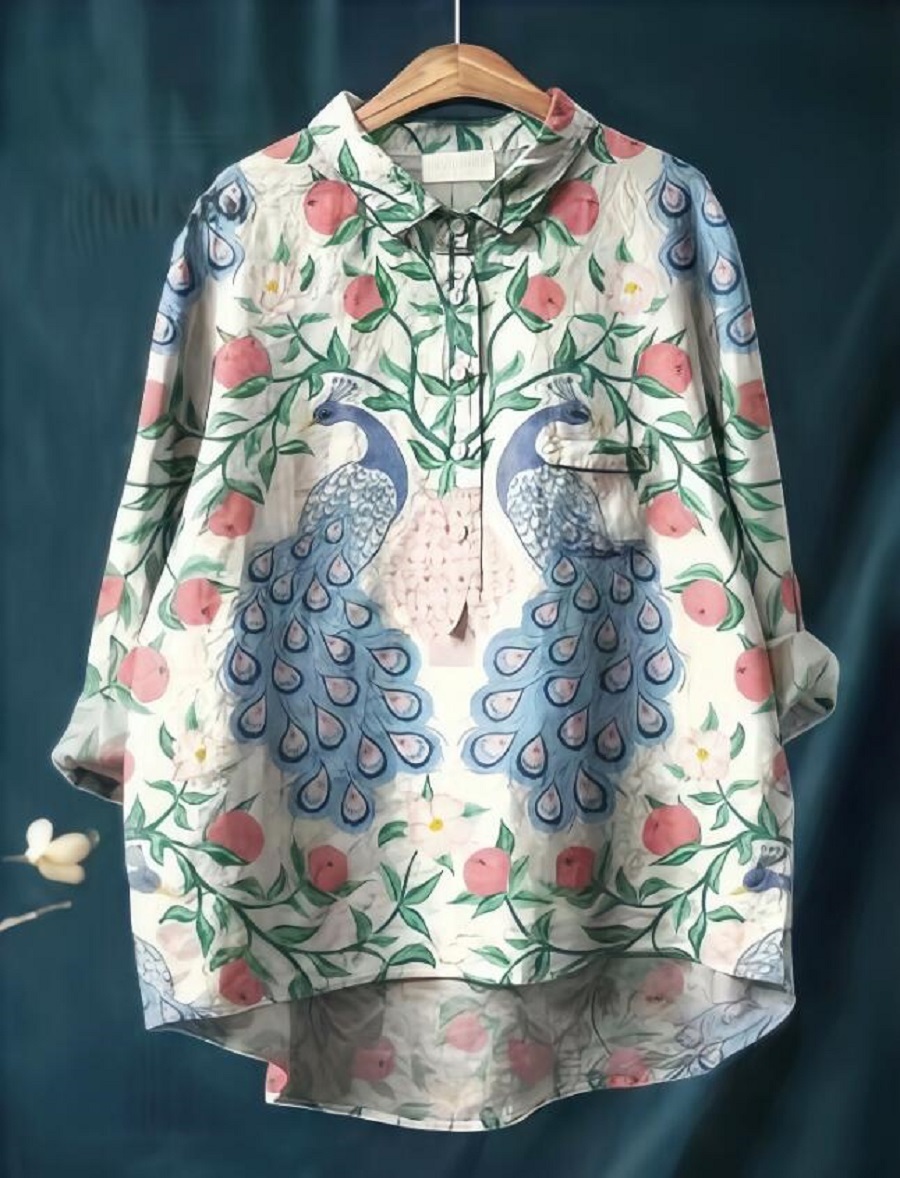 同梱1万円送料無料■オシャレ シャツ ブラウス 着痩せ チュニックシャツ 綿麻 プリント柄 トップス レ ディース 長袖 体型カバー 白