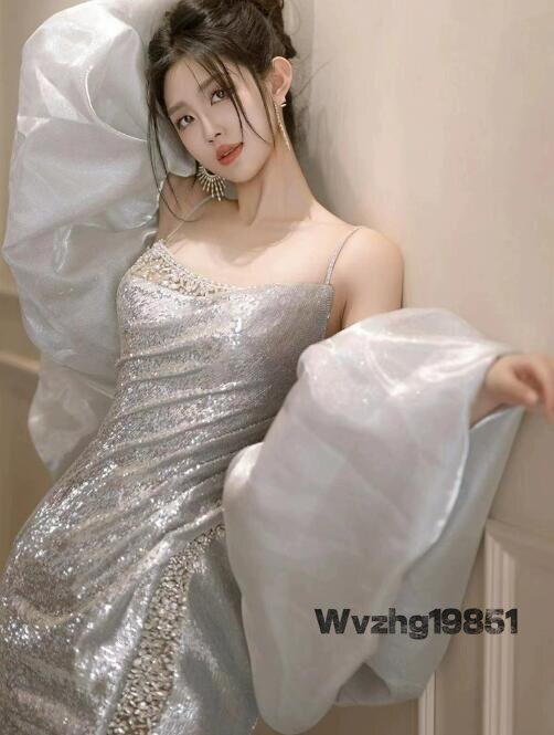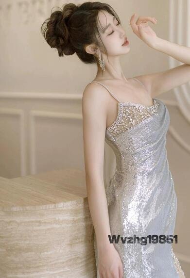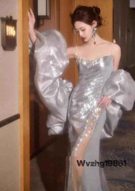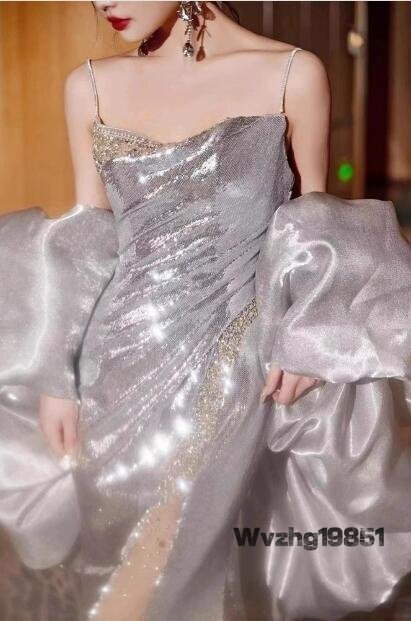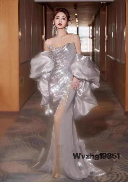| シルバースパンコールドレス高級敬酒服司会者ドレス声楽芸考ドレスS ~ 3 XL選択 素材:ポリエステル繊維 サイズ:XS、S、M、L、XL、XXL |