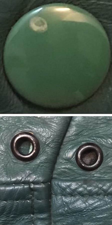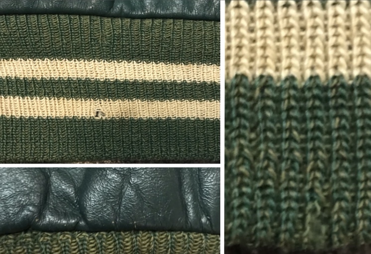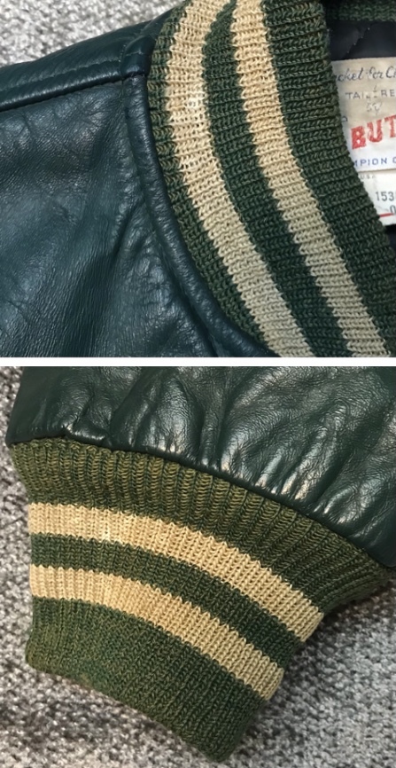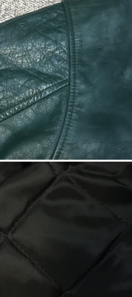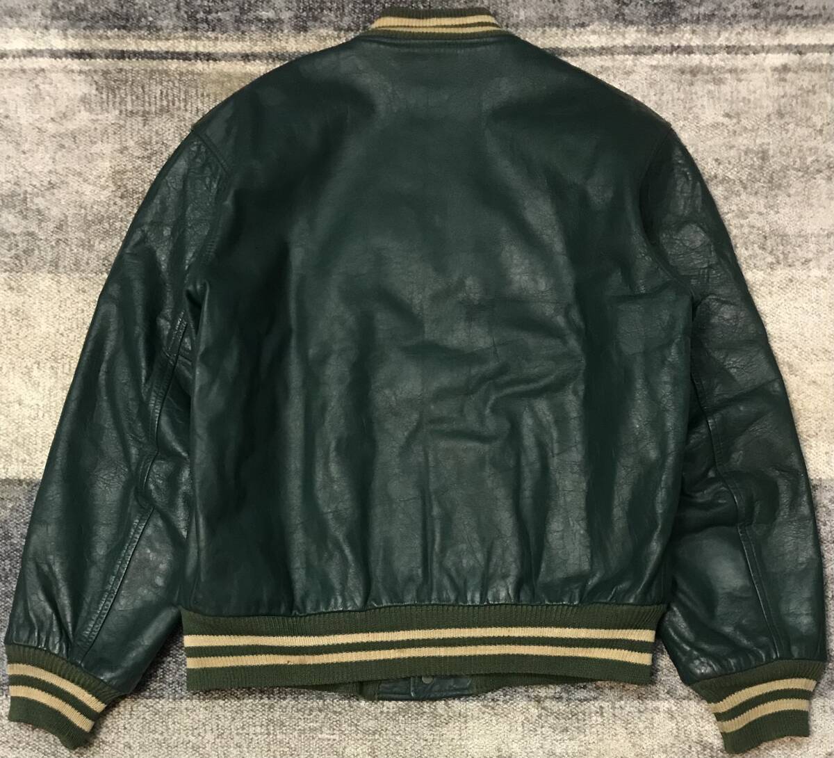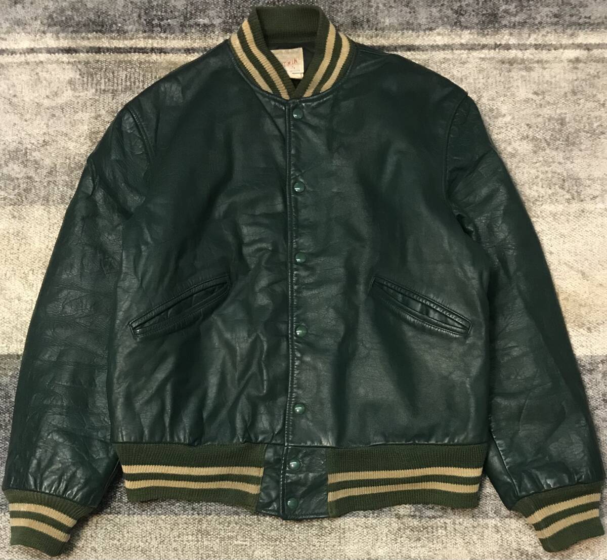 非常に珍しいグリーン単色のオールレザーに、襟、裾、袖のリブ切替が目を惹く、非常にカッコいい1枚です。