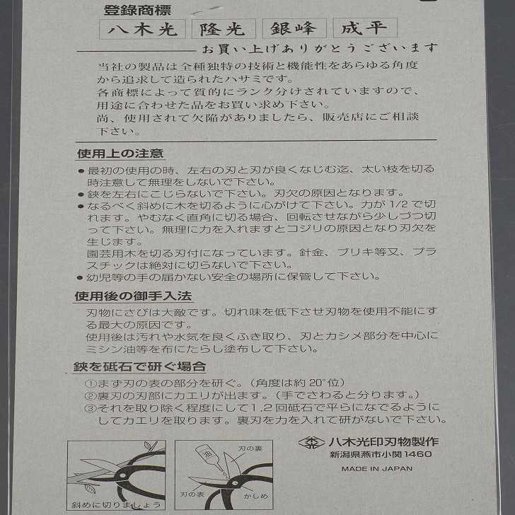 | 商品説明 | 登録商標 八木光 独特の技術と機能性をあらゆる角度から追求して造られたハサミです。 用途に合わせた品をお買い求めください。 使用上の注意 最初の使用の時、左右の刃と刃が良くなじむま迄、太い枝を切る時注意して無理をしないで下さい。 園芸用木を切る刃付になっています。針金、フリキ等又、プラスチックは絶対に切らないで下さい。 幼児等の手の届かない安全な場所に保管してください。 使用後の御手入法 刃物にさびは大敵です。切れ味を低下させ刃物を使用不能にする最大の原因です。 使用後は汚れや水気を良くふき取り、刃をカシメ部分を中心にミシン油等を布にたらし塗布して下さい。 |